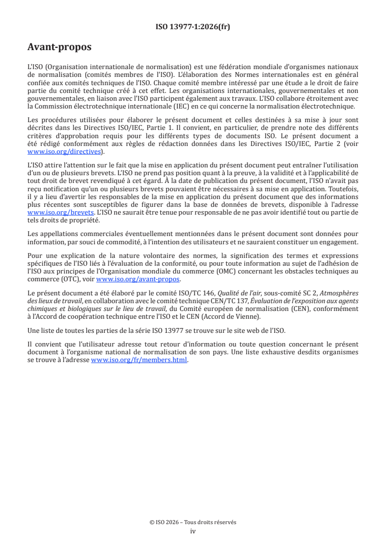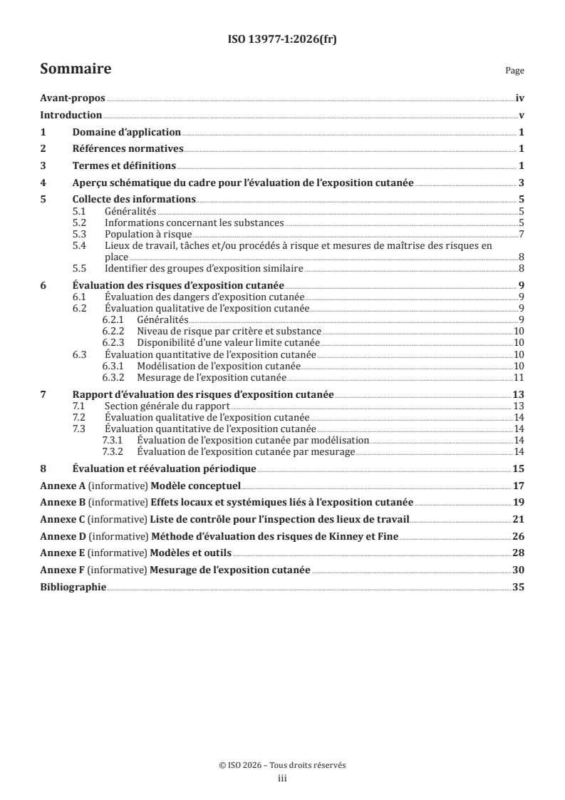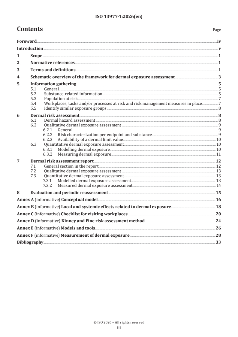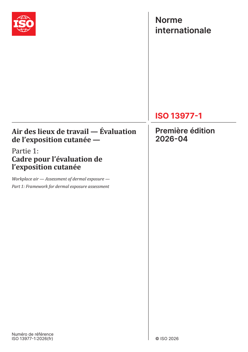 ISO 13977-1:2026 is a standard published by the International Organization for Standardization (ISO). Its full title is "Workplace air — Assessment of dermal exposure — Part 1: Framework for dermal exposure assessment". This standard covers: This document specifies a framework introducing the approaches that can be applied to assess the risks linked to dermal exposure to chemical substances in the workplace. This document provides guidance on the different steps to be taken when performing qualitative and quantitative dermal exposure assessments. This document is not applicable to inhalation, oral, ocular and mucous membranes exposure, biological agents, wet work and mechanical stressors.