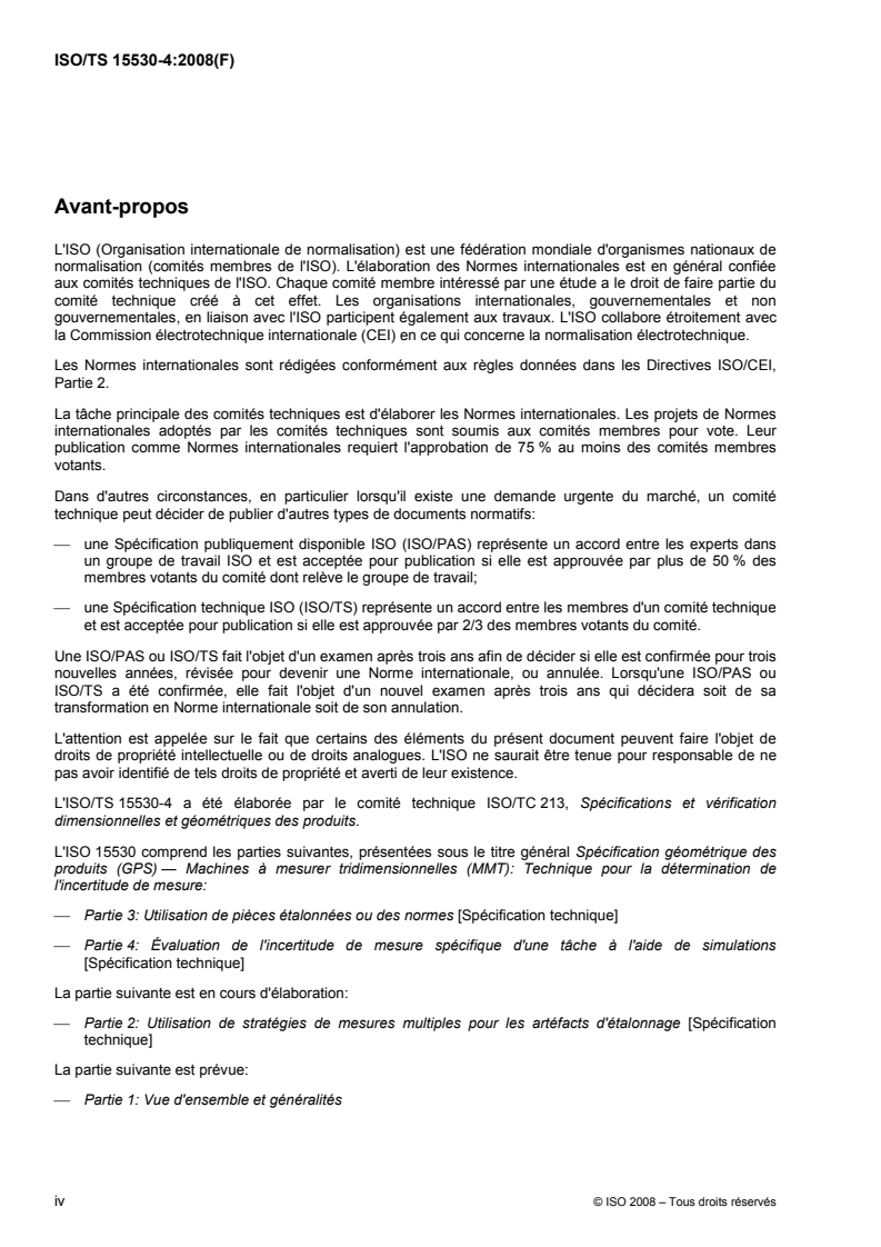 ISO/TS 15530-4:2008 - Spécification géométrique des produits (GPS) — Machines à mesurer tridimensionnelles (MMT): Technique pour la détermination de l'incertitude de mesure — Partie 4: Évaluation de l'incertitude de mesure spécifique d'une tâche à l'aide de simulations Released:5/22/2008