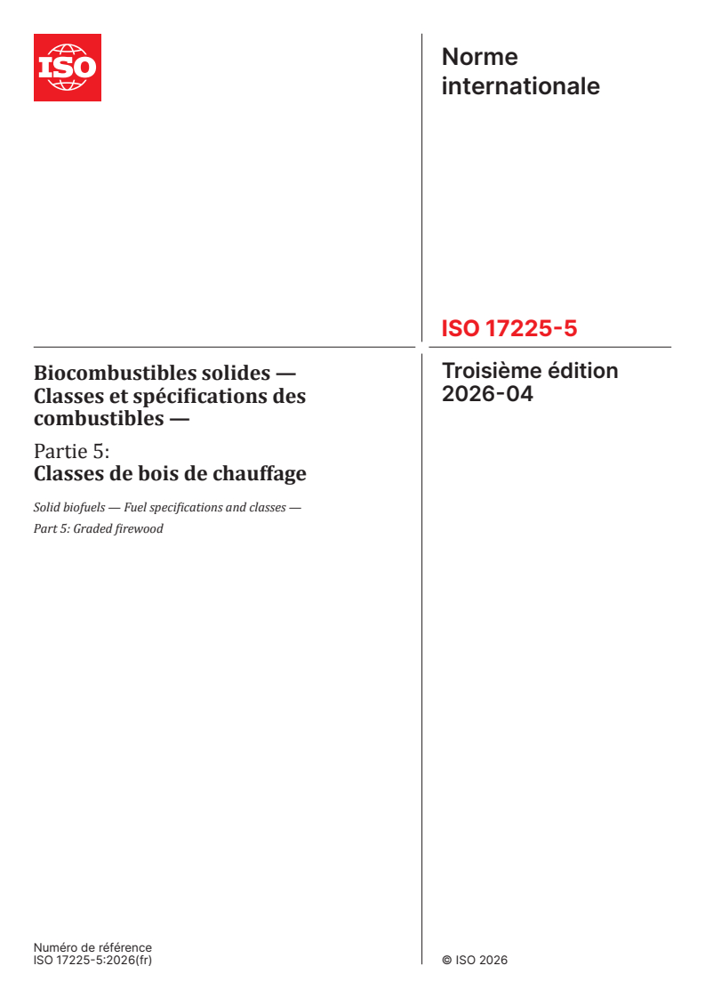 ISO 17225-5:2026 - Biocombustibles solides — Classes et spécifications des combustibles — Partie 5: Classes de bois de chauffage