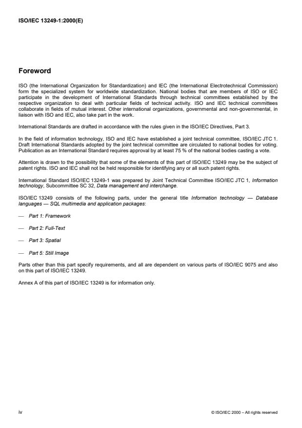 ISO/IEC 13249-1:2000 is a standard published by the International Organization for Standardization (ISO). Its full title is "Information technology — Database languages — SQL multimedia and application packages — Part 1: Framework". This standard covers: Information technology — Database languages — SQL multimedia and application packages — Part 1: Framework