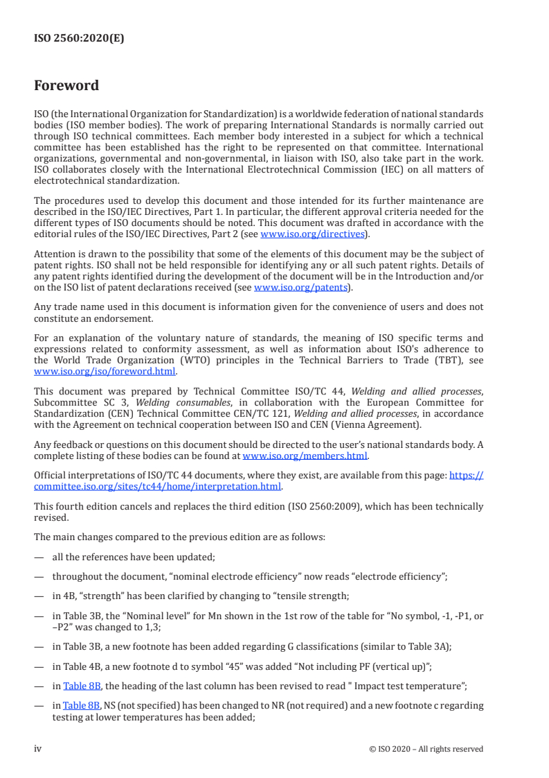ISO 2560:2020 is a standard that specifies the requirements for the classification of covered electrodes and deposited metal used in manual metal arc welding of non-alloy and fine grain steels. The classification is based on the yield strength and average impact energy or the tensile strength and average impact energy of the all-weld metal. The document provides specific clauses, subclauses, and tables for each classification system.