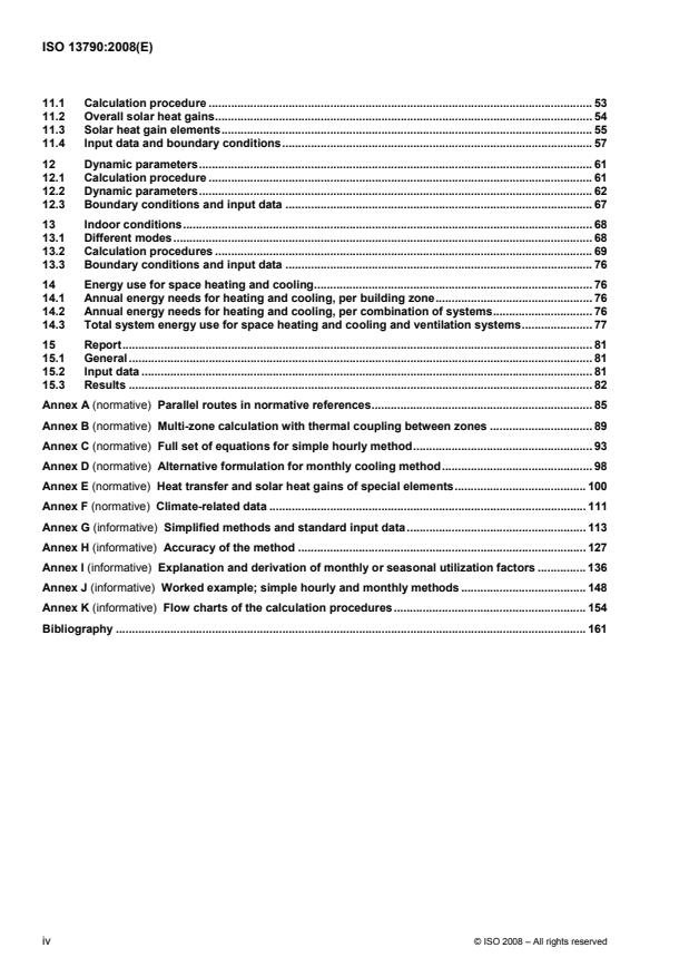 ISO 13790:2008 gives calculation methods for assessment of the annual energy use for space heating and cooling of a residential or a non-residential building, or a part of it, referred to as “the building”. This method includes the calculation of: the heat transfer by transmission and ventilation of the building zone when heated or cooled to constant internal temperature; the contribution of internal and solar heat gains to the building heat balance; the annual energy needs for heating and cooling, to maintain the specified set-point temperatures in the building – latent heat not included; the annual energy use for heating and cooling of the building, using input from the relevant system standards referred to in ISO 13790:2008 and specified in Annex A. ISO 13790:2008 also gives an alternative simple hourly method, using hourly user schedules (such as temperature set-points, ventilation modes or operation schedules of movable solar shading). Procedures are given for the use of more detailed simulation methods to ensure compatibility and consistency between the application and results of the different types of method. ISO 13790:2008 provides, for instance, common rules for the boundary conditions and physical input data irrespective of the calculation approach chosen. ISO 13790:2008 has been developed for buildings that are, or are assumed to be, heated and/or cooled for the thermal comfort of people, but can be used for other types of building or other types of use (e.g. industrial, agricultural, swimming pool), as long as appropriate input data are chosen and the impact of special physical conditions on the accuracy is taken into consideration. The calculation procedures in ISO 13790:2008 are restricted to sensible heating and cooling. The energy use due to humidification is calculated in the relevant standard on the energy performance of ventilation systems, as specified in Annex A; similarly, the energy use due to dehumidification is calculated in the relevant standard on the energy performance of space cooling systems, as specified in Annex A. ISO 13790:2008 is applicable to buildings at the design stage and to existing buildings. The input data directly or indirectly called for by ISO 13790:2008 should be available from the building files or the building itself. If this is not the case, it is explicitly stated at relevant places in ISO 13790:2008 that it may be decided at national level to allow for other sources of information. In this case, the user reports which input data have been used and from which source. Normally, for the assessment of the energy performance for an energy performance certificate, a protocol is defined at national or regional level to specify the type of sources of information and the conditions when they may be applied instead of the full required input.