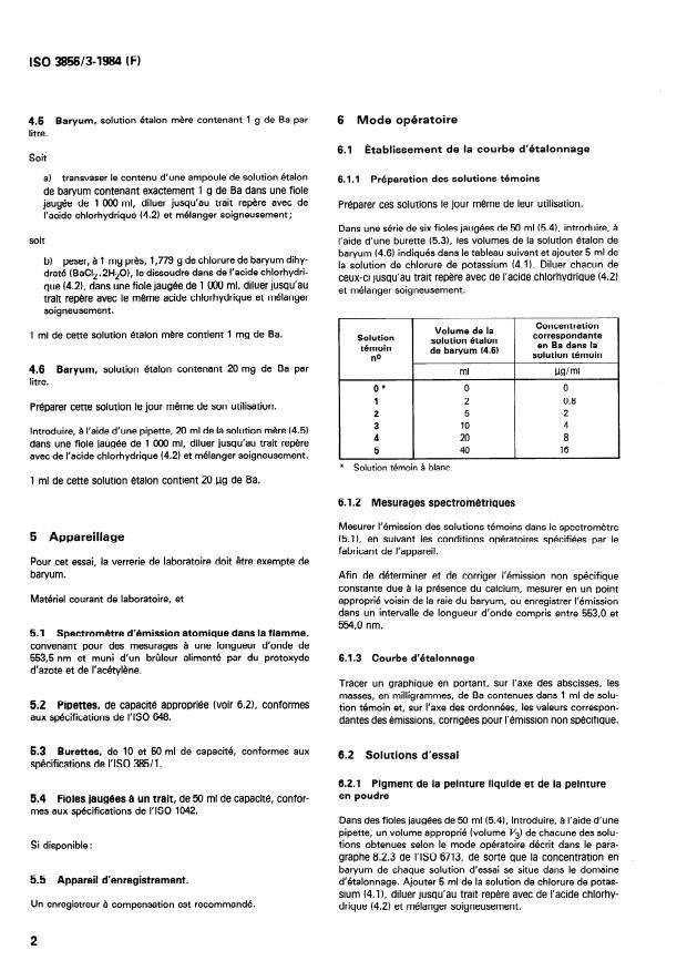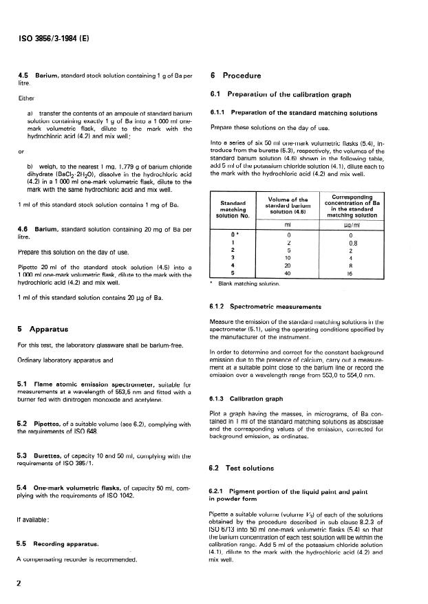 The principle consists in the aspiration of the test solution into a dinitrogen monoxide/acetylene flame. Measurement of the radiation emitted by barium at a wavelength of 553,5 nm. The ionization of barium atoms in the flame is suppressed by addition of potassium chloride. The method is applicable to coating materials having "soluble" barium contents in the range of about 0,05 % (m/m) to 5 % (m/m). This method is the referee method in cases of dispute. This second edition cancels and replaces ISO 3856/3-1980, of which it constitutes a thorough revision.