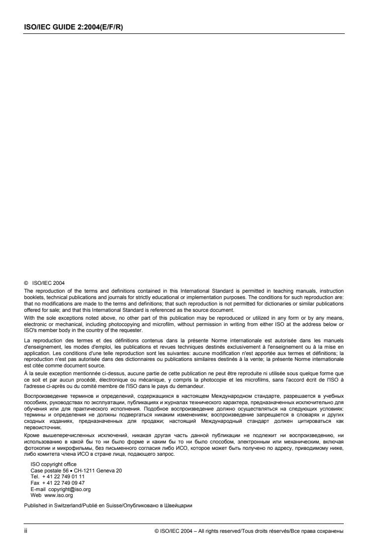 ISO/IEC Guide 2:2004 is a document that provides definitions and terms related to standardization. The purpose of this guide is to promote understanding between members of ISO and IEC, as well as various government and non-government organizations involved in standardization at different levels. It also serves as a resource for teaching and reference on the principles of standardization, certification, and laboratory accreditation. The guide does not aim to duplicate definitions found in other international vocabularies, such as the International vocabulary of basic and general terms in metrology (VIM). The guide is available in multiple languages, including English, French, Russian, German, Spanish, Italian, Dutch, and Swedish.