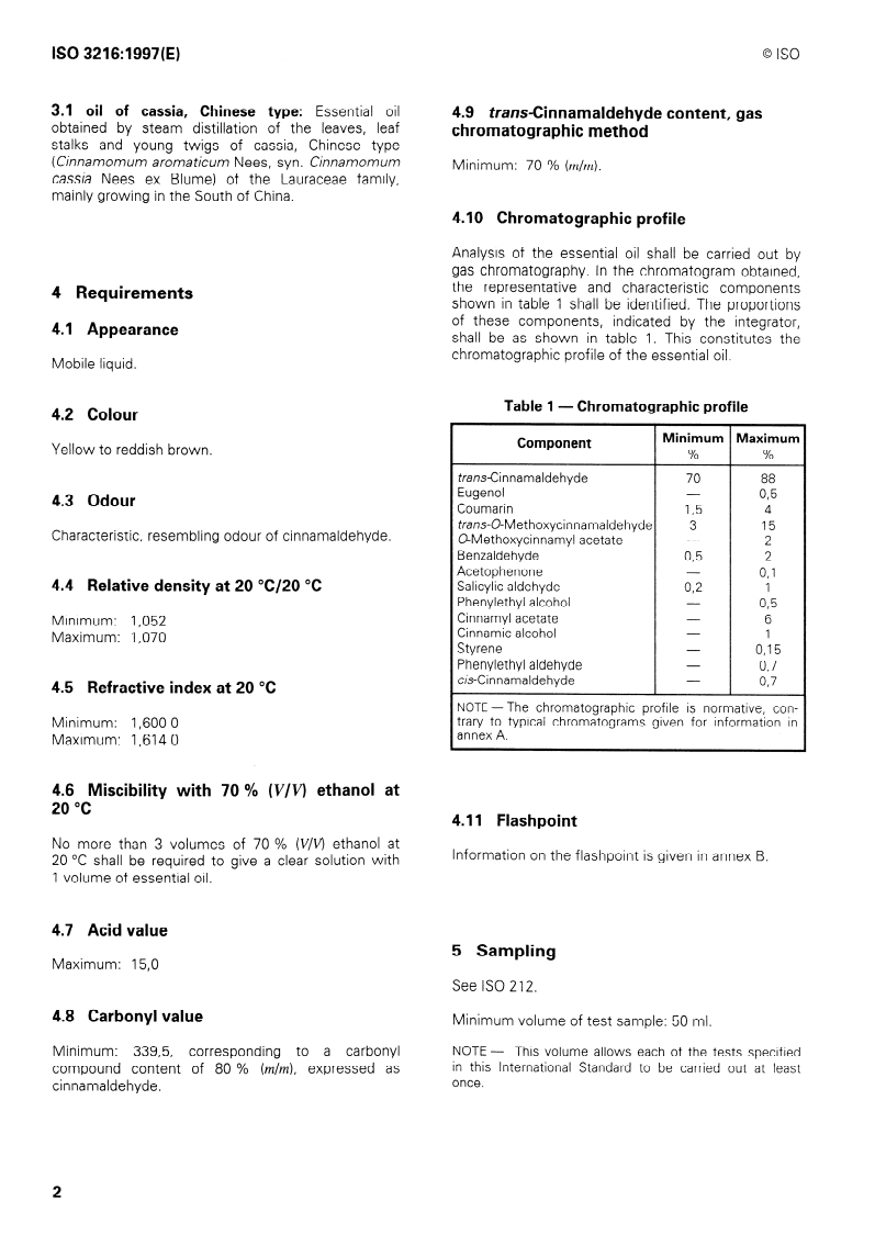 Keywords: ISO 3216, Oil of cassia, Chinese cassia oil, Cinnamomum aromaticum, essential oil standard, cinnamaldehyde content, gas chromatography, essential oil quality, chromatographic profile, essential oil testing methods, ISO standards, essential oil packaging.