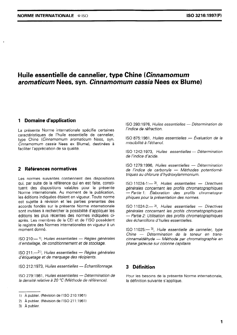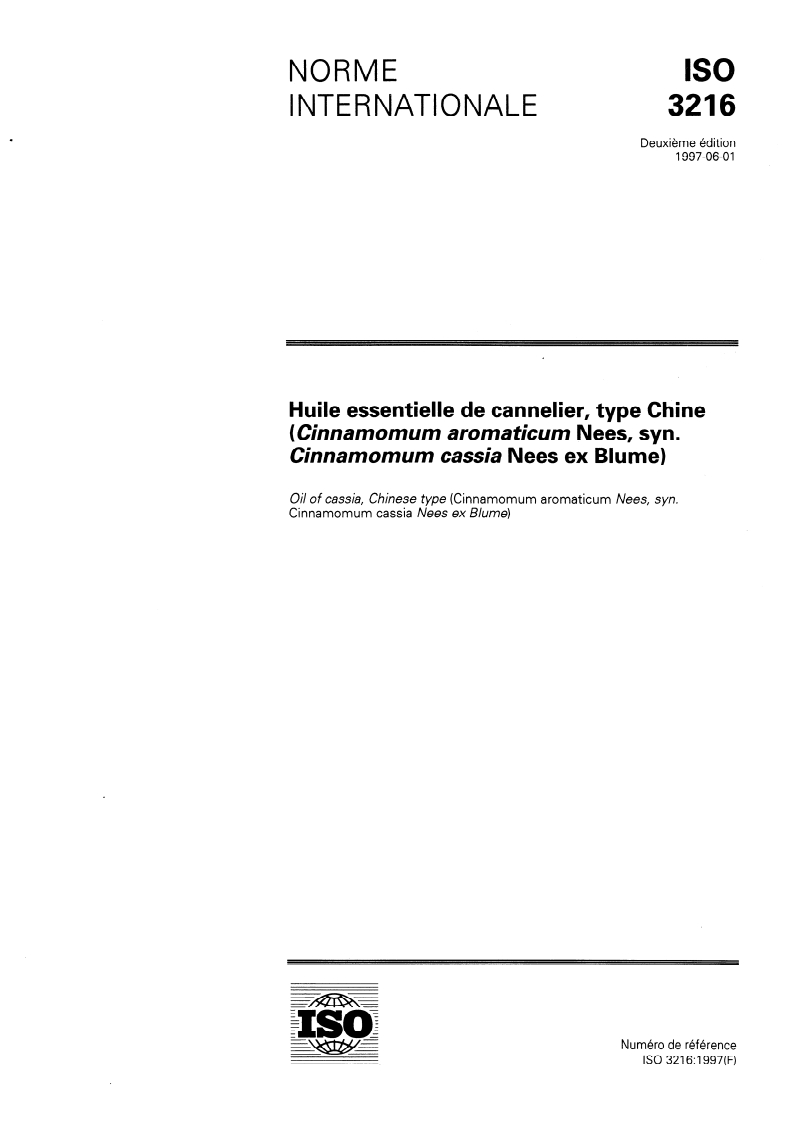 ISO 3216:1997 - Huile essentielle de cannelier type Chine (Cinnamomum aromaticum Nees, syn. Cinnamomum cassia Nees ex Blume) Released:6/5/1997