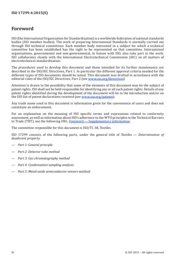 ISO 17299-4:2015 - 텍스타일 - 불쾌한 냄새 특성 측정 - 제 4부 : 응축 샘플링 분석 은 모든 텍스타일 제품에 대해 응축 샘플링 방법을 사용한 후 분석 장비를 사용하여 불쾌한 냄새 테스트 방법을 설명하는 표준이다. 이 방법은 인돌, 메틸메르캡탄, 황화수소, 이소벨릭 산 및 노넨알과 같은 기체 냄새 화학물질에 적용할 수 있다.