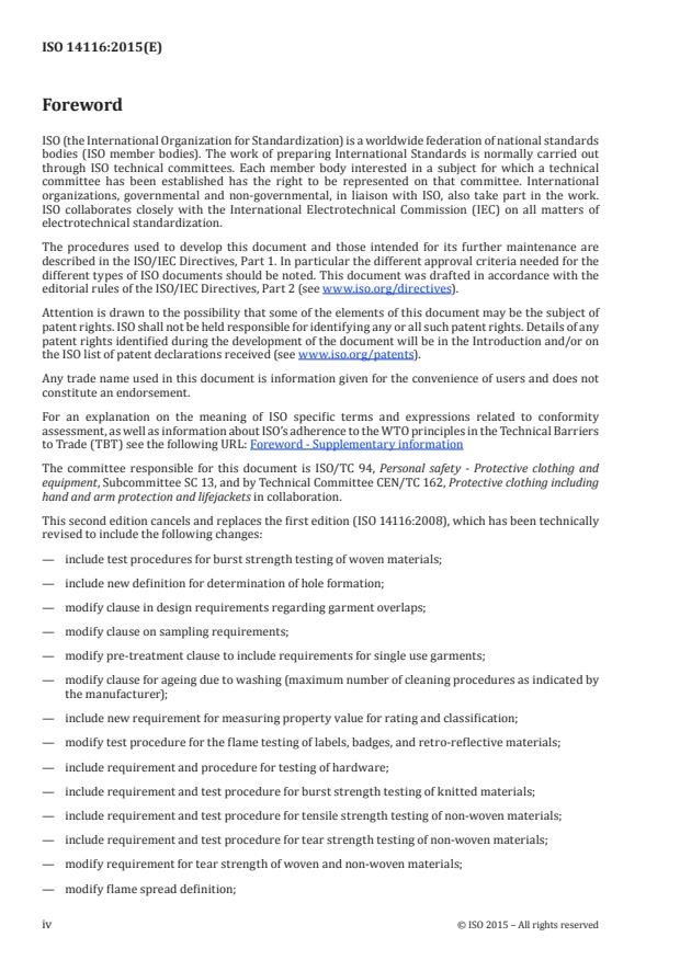 Keywords: ISO 14116, protective clothing, limited flame spread, ISO 15025, flame protection, material assemblies, classification, garment marking, mechanical requirements.