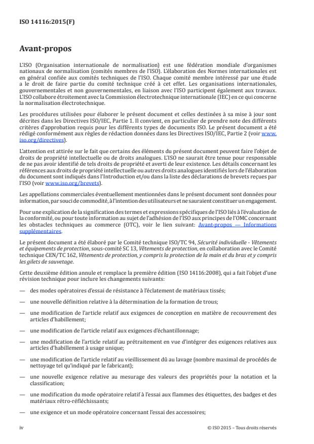 L'ISO 14116:2015 spécifie les exigences de performance relatives aux matériaux, aux assemblages de matériaux et aux vêtements de protection à propagation de flamme limitée afin de réduire le risque qu'un vêtement brûle lors d'un contact occasionnel et de courte durée avec de petites flammes, constituant ainsi par lui-même un danger. D'autres exigences s'appliquant aux vêtements sont également spécifiées, notamment des exigences de conception, des exigences mécaniques, ainsi que des exigences relatives au marquage et à la notice d'information du fabricant.