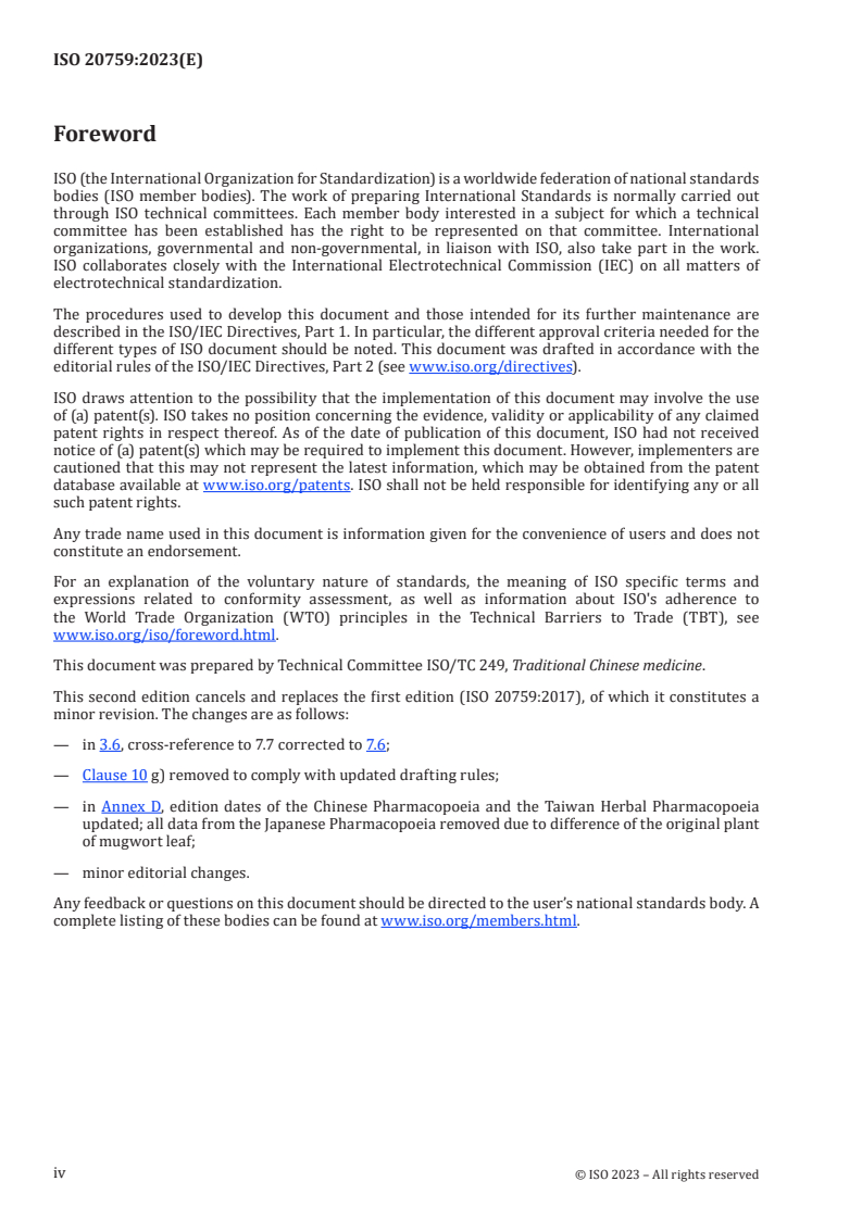 ISO 20759:2023 is a standard published by the International Organization for Standardization (ISO). Its full title is "Traditional Chinese medicine - Artemisia argyi leaf". This standard covers: This document specifies the minimum requirements and test methods of Artemisia argyi leaf for medicinal use. It is suitable for identification and quality control of this herbal medicine.