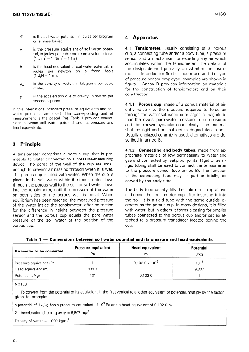 ISO 11276:1995 is a standard published by the International Organization for Standardization (ISO). Its full title is "Soil quality - Determination of pore water pressure - Tensiometer method". This standard covers: Describes methods for the determination of pore water pressure (point measurements) in unsaturated and saturated soil using tensiometers. Applicable for in situ measurements in the field and, e. g. soil cores, used in experimental examinations.