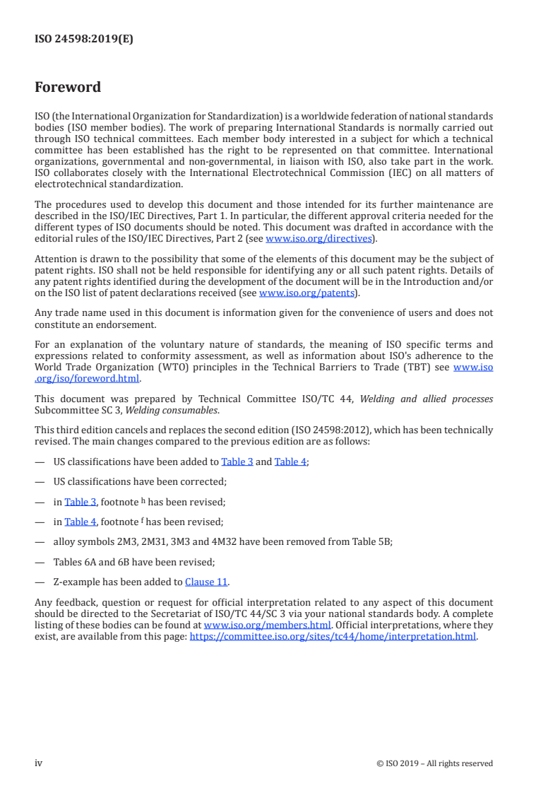 ISO 24598:2019 is a standard published by the International Organization for Standardization (ISO). Its full title is "Welding consumables - Solid wire electrodes, tubular cored electrodes and electrode-flux combinations for submerged arc welding of creep-resisting steels - Classification". This standard covers: This document specifies requirements for classification of solid wire electrodes, tubular cored electrodes and electrode/flux combinations (all-weld metal deposits) for submerged arc welding of creep resisting and low-alloy elevated-temperature application steels. One electrode can be tested and classified with different fluxes. The solid wire electrode is also classified separately based on its chemical composition. This document is a combined specification providing a classification system based on either: - the chemical composition of the solid wire electrode and all-weld metal deposit; or - the tensile strength of the all-weld metal deposit and the chemical composition of the solid wire electrode and all-weld metal deposit obtained with the electrode/flux combination. Clauses, subclauses and tables which carry the suffix letter "A" are applicable only to solid wire electrodes, tubular cored electrodes and all-weld metal deposits classified in accordance with the system based upon chemical composition. Clauses, subclauses and tables which carry the suffix letter "B" are applicable only to solid wire electrodes, tubular cored electrodes and all-weld metal deposits classified in accordance with the system based upon the tensile strength of all-weld metal deposits and the chemical composition of solid wire electrodes and all-weld metal deposits. Clauses, subclauses and tables which do not have either the suffix letter "A" or the suffix letter "B" are applicable to all solid wire electrodes, tubular cored electrodes and electrode/flux combinations classified under this document.