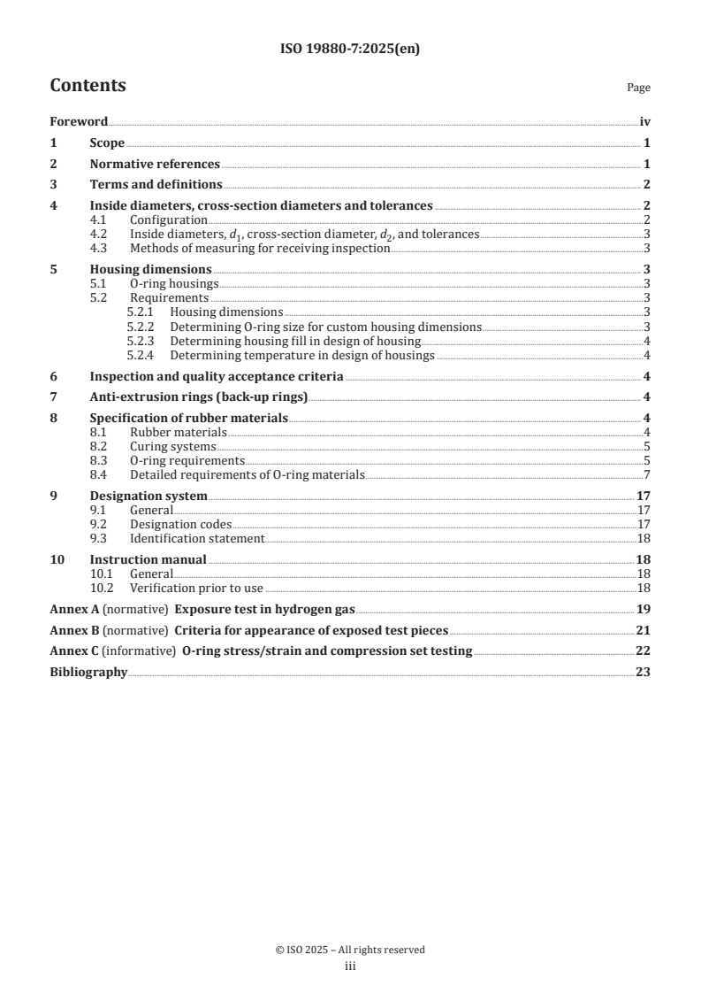 - Housing dimensions and fill: Groove and housing design follow ISO 3601‑2. Housing fill must not exceed 85% (adjusted for O‑ring volume inflation due to hydrogen exposure); the standard includes procedures to calculate corrected fill using a volume inflation ratio determined by Annex A exposure tests.