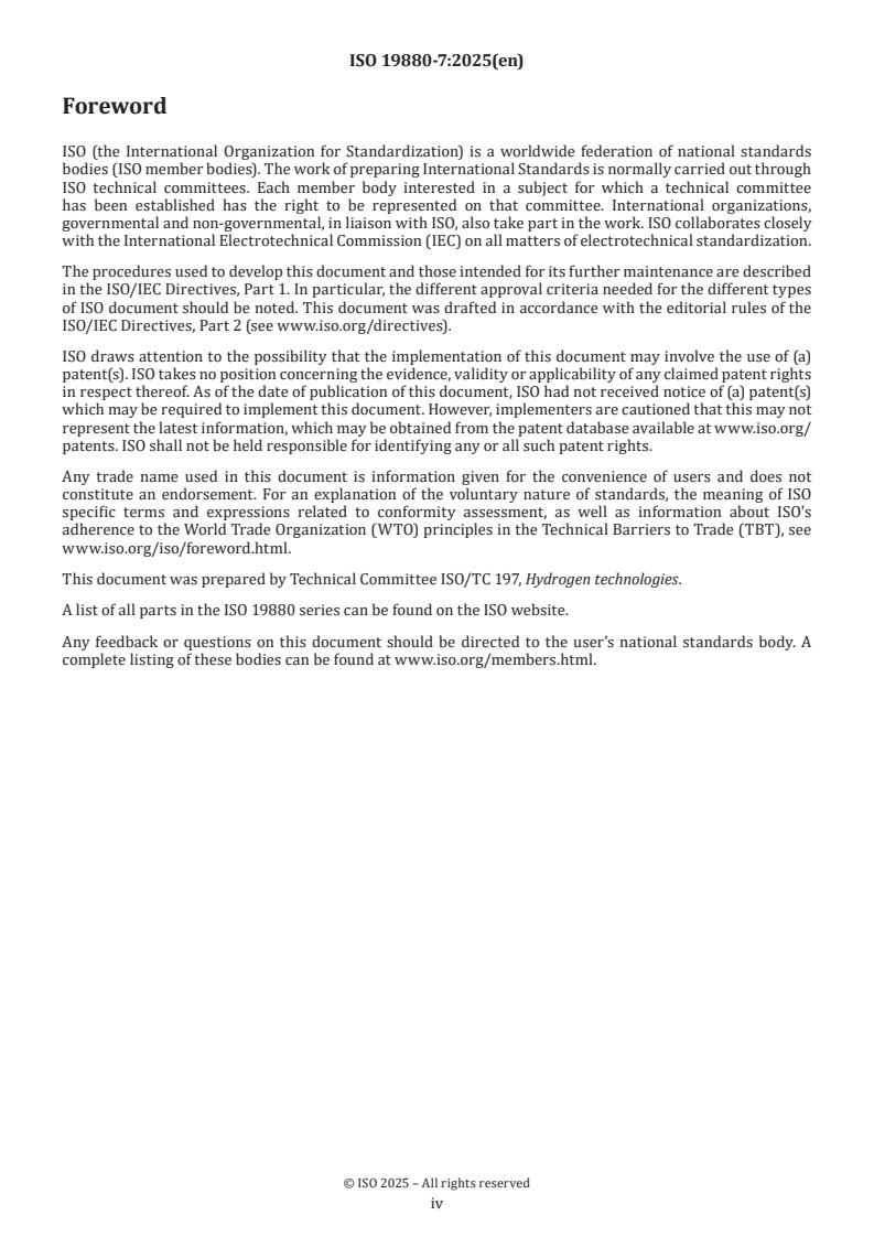 ISO 19880-7:2025 is a standard published by the International Organization for Standardization (ISO). Its full title is "Gaseous hydrogen - Fuelling stations - Part 7: Rubber O-rings". This standard covers: This document specifies the requirements for rubber O-rings and their housing dimensions, which seal gaseous hydrogen, in high-pressure hydrogen devices for gaseous hydrogen fuelling stations, such as valves, filters, joints, breakaways and other such devices. This document is applicable to O-rings suitable for sealing hydrogen gas of up to 70 MPa nominal working pressure, in the operating temperature range of −40 °C to 65 °C. This document contains safety requirements for the design of O-rings and their housing dimensions, compound design, and test methods for seal systems. This document applies to newly manufactured O-rings for hydrogen gas seal in high-pressure hydrogen devices used in hydrogen fuelling stations. NOTE 1 This document was developed using the ISO 3601 series. NOTE 2 This document was developed based on several temperature classes of rubber O-rings suitable for use with high-pressure hydrogen seals in devices for gaseous hydrogen stations. NOTE 3 The operating temperature is not a temperature of the hydrogen gas to be sealed by the O-ring gas seal system. Regardless of the operating temperature, the hydrogen gas temperature to be sealed can rise up to 180 °C. NOTE 4 The O-ring seal system for the high-pressure hydrogen devices are designed by the device manufacturers. The detailed specifications of the O-rings and design of static or non-static high-pressure hydrogen seal systems for the high-pressure hydrogen devices are determined as agreed upon between the interested parties by referring to this document.