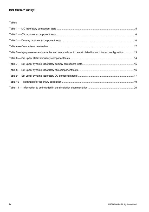 The purposes of ISO 13232-7:2005 are to provide: conventions for calibrating and documenting the important features of the simulation models; guidelines for definition and use of mathematical models for motorcycle impact simulations, which can be correlated against data for full-scale tests; a means for identifying possible additional impact conditions for full-scale testing; and a standardized tool, of optional use, for risk/benefit analysis of rider crash protective devices fitted to motorcycles, based upon the population of impact conditions identified in ISO 13232-2. ISO 13232 specifies the minimum requirements for research into the feasibility of protective devices fitted to motorcycles, which are intended to protect the rider in the event of a collision. ISO 13232 is applicable to impact tests involving: two-wheeled motorcycles; the specified type of opposing vehicle; either a stationary and a moving vehicle or two moving vehicles; for any moving vehicle, a steady speed and straight-line motion immediately prior to impact; one helmeted dummy in a normal seating position on an upright motorcycle; the measurement of the potential for specified types of injury by body region; and evaluation of the results of paired impact tests (i.e. comparisons between motorcycles fitted and not fitted with the proposed devices). ISO 13232 does not apply to testing for regulatory or legislative purposes.