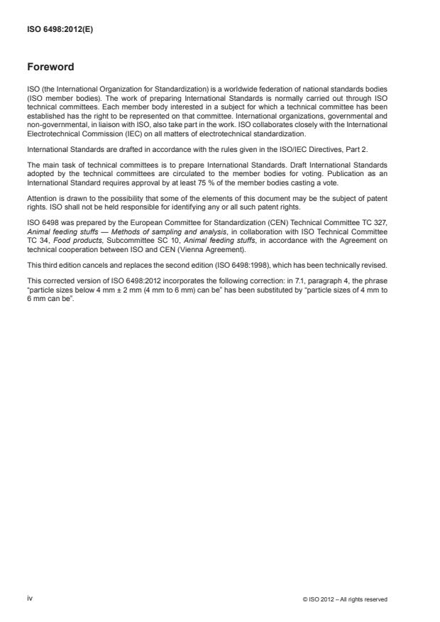 ISO 6498:2012 is a standard published by the International Organization for Standardization (ISO). Its full title is "Animal feeding stuffs - Guidelines for sample preparation". This standard covers: ISO 6498:2012 specifies guidelines for the preparation of test samples from laboratory samples of animal feeding stuffs, including pet foods. The guidelines are overruled by special instructions and regulations for sample preparation demanded by specific analysis methods.