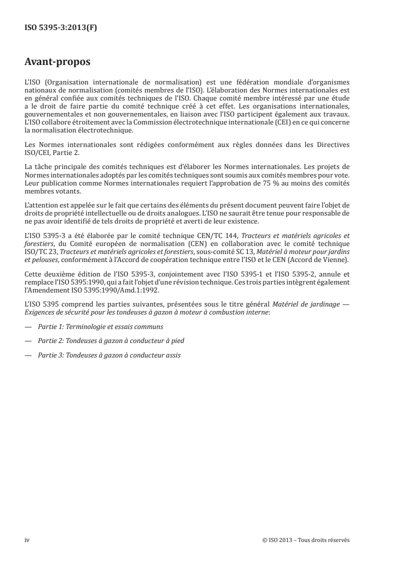 L'ISO 5395-3:2013 spécifie les exigences de sécurité, et les méthodes utilisées pour leur vérification, applicables aux tondeuses à gazon à moteur à combustion interne, à axe vertical ou à lames hélicoïdales, et à conducteur assis, équipées d'un organe de coupe métallique, et/ou d'un organe de coupe non métallique avec un ou plusieurs éléments de coupe montés sur une unité centrale, pivotante en général circulaire: l'action de coupe de ces éléments dépend de la force centrifuge et l'énergie cinétique de chacun est égale ou supérieure à 10 J. L'ISO 5395-3:2013 n'est pas applicable: aux tondeuses à gazon robotisées et télécommandées, tondeuses à fléaux, faucheuses, motofaucheuses à barre de coupe, tondeuses remorquées/semi-portées et débroussailleuses; aux assemblages d'organes de coupe lorsqu'ils sont utilisés avec un tracteur agricole; aux tondeuses à gazon électriques et à batterie. L'ISO 5395-3:2013 traite de tous les phénomènes dangereux significatifs, situations ou événements dangereux applicables aux tondeuses à gazon lorsqu'elles sont utilisées comme prévu et dans des conditions de mauvaise utilisation raisonnablement prévisibles par le fabricant. L'ISO 5395-3:2013 n'est pas applicable aux tondeuses à gazon qui sont fabriquées avant sa date de publication.