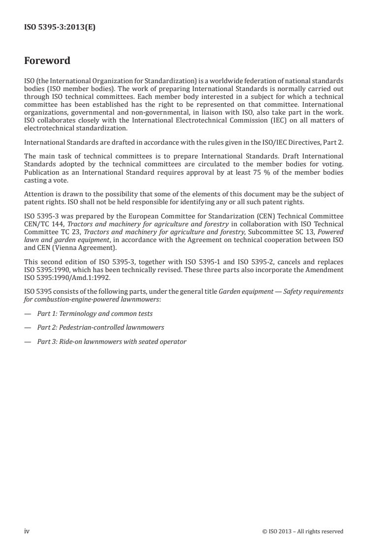 ISO 5395-3:2013 is a standard published by the International Organization for Standardization (ISO). Its full title is "Garden equipment - Safety requirements for combustion-engine-powered lawnmowers - Part 3: Ride-on lawnmowers with seated operator". This standard covers: ISO 5395-3:2013 specifies safety requirements and their verification for combustion-engine-powered ride-on (seated) rotary lawnmowers and cylinder lawnmowers (hereafter named "lawnmower"), and equipped with: metallic cutting means; and/or non-metallic cutting means with one or more cutting elements pivotally mounted on a generally circular drive unit, where these cutting elements rely on centrifugal force to achieve cutting, and have a kinetic energy for each single cutting element of 10 J or more. It does not apply to: robotic and remote-controlled lawnmowers, flail mowers, grassland mowers, sickle bar mowers, towed/semi-mounted grass-cutting machines, and scrub-clearing machines; cutting-means assembly when used in combination with an agricultural tractor; electrically powered and battery-powered lawnmowers. ISO 5395-3:2013 deals with all significant hazards, hazardous situations or events relevant to lawnmowers when used as intended and under the conditions of misuse which are reasonably foreseeable by the manufacturer. It is not applicable to lawnmowers which are manufactured before the date of publication of this document.
