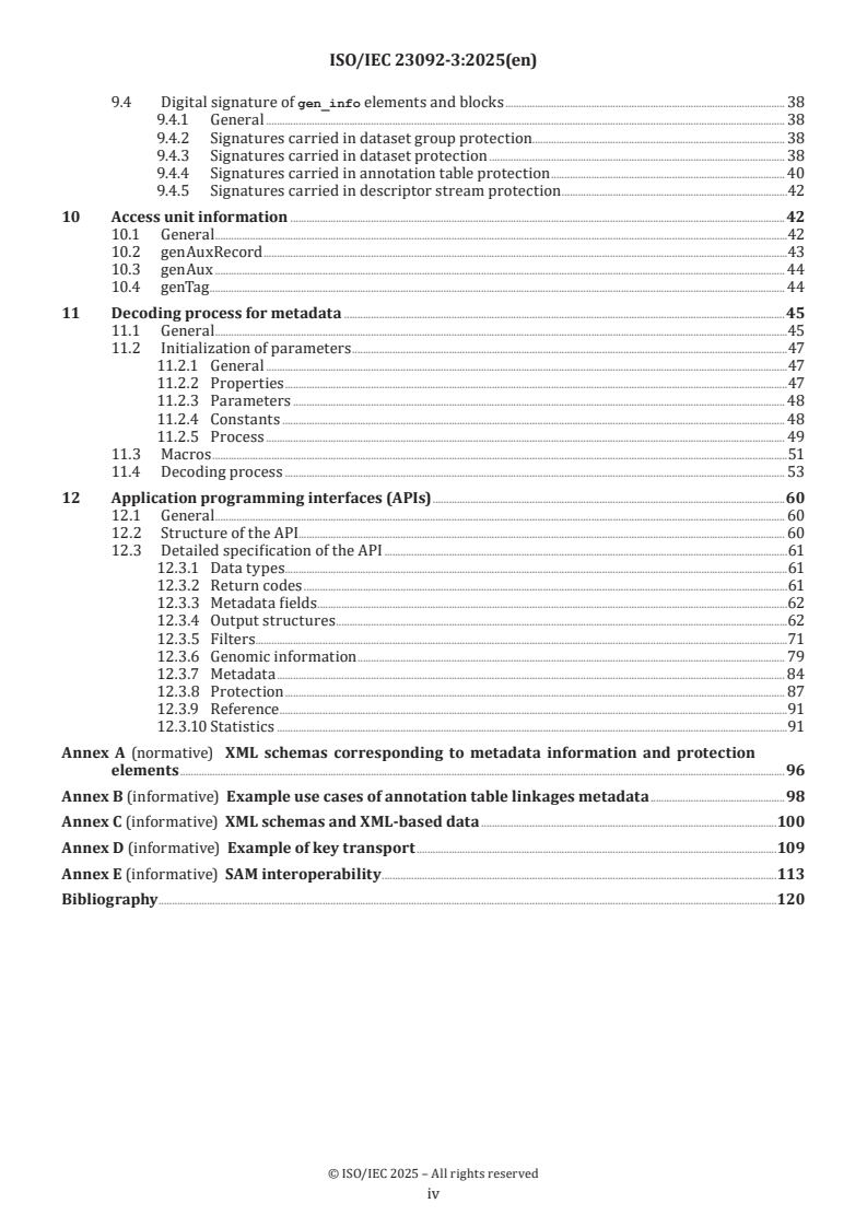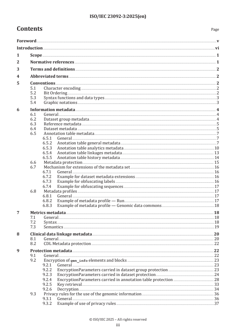 This document specifies information metadata, metrics metadata, clinical data linkage metadata, auxiliary fields, SAM interoperability, protection metadata and programming interfaces of genomic information. It defines: - metadata storage and interpretation for the different encapsulation levels as specified in ISO/IEC 23092-1 (in REF Section_sec_6 \r \h Clause 6 08D0C9EA79F9BACE118C8200AA004BA90B02000000080000000E000000530065006300740069006F006E005F007300650063005F0036000000 ); - metrics metadata containing sequencing data metrics at the dataset and access unit levels as specified in ISO/IEC 23092-1 (in REF Section_sec_7 \r \h Clause 7 08D0C9EA79F9BACE118C8200AA004BA90B02000000080000000E000000530065006300740069006F006E005F007300650063005F0037000000 ); - clinical data linkage metadata stored at the dataset group, dataset and annotation table levels as specified in ISO/IEC 23092-1 (in REF Section_sec_8 \r \h Clause 8 08D0C9EA79F9BACE118C8200AA004BA90B02000000080000000E000000530065006300740069006F006E005F007300650063005F0038000000 ); - protection elements providing confidentiality, integrity and privacy rules at the different encapsulation levels as specified in ISO/IEC 23092-1 (in REF Section_sec_9 \r \h Clause 9 08D0C9EA79F9BACE118C8200AA004BA90B02000000080000000E000000530065006300740069006F006E005F007300650063005F0039000000 ); - how to associate auxiliary fields to encoded reads (in REF Section_sec_10 \r \h Clause 10 08D0C9EA79F9BACE118C8200AA004BA90B02000000080000000F000000530065006300740069006F006E005F007300650063005F00310030000000 ); - interfaces to access genomic information coded in compliance with ISO/IEC 23092-1 and ISO/IEC 23092-2 (in REF Section_sec_12 \r \h Clause 12 08D0C9EA79F9BACE118C8200AA004BA90B02000000080000000F000000530065006300740069006F006E005F007300650063005F00310032000000 ); - mechanisms for backward compatibility with existing SAM content, and exportation to this format (in Annex E).