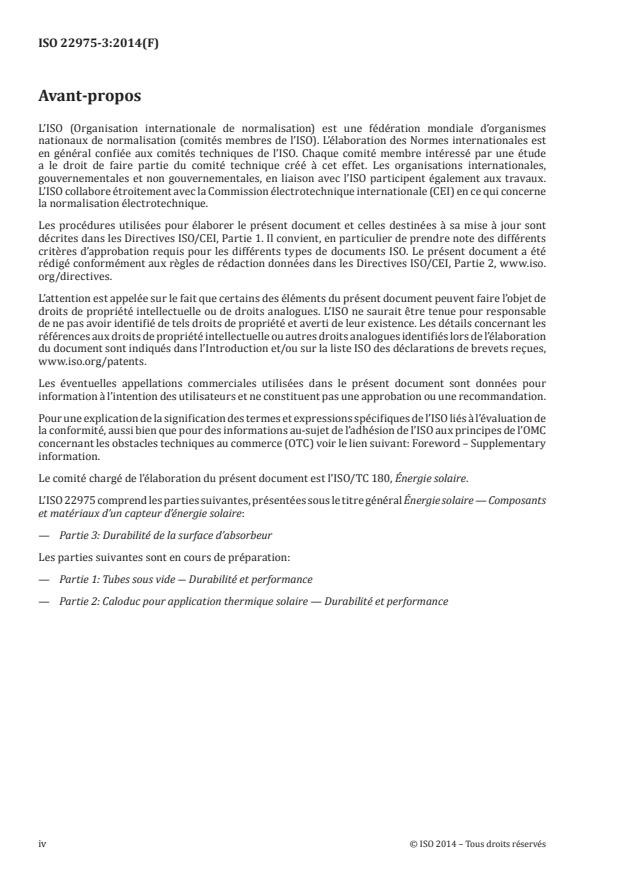 ISO 22975-3:2014 is a standard published by the International Organization for Standardization (ISO). Its full title is "Solar energy - Collector components and materials - Part 3: Absorber surface durability". This standard covers: ISO 22975-3:2014 is applicable to the determination of the long term behaviour and service life of selective solar absorbers for use in vented flat plate solar collectors working under conditions corresponding to that in a typical solar domestic hot water system or combisystem. ISO 22975-3:2014 specifies a failure criterion of a solar absorber based on changes in optical performance of the absorber. The optical properties of interest are solar absorptance and thermal emittance. ISO 22975-3:2014 specifies durability testing procedures focused on resistance to high temperatures and condensation of water on the absorber surface as well as high humidity in the presence of sulfur dioxide.