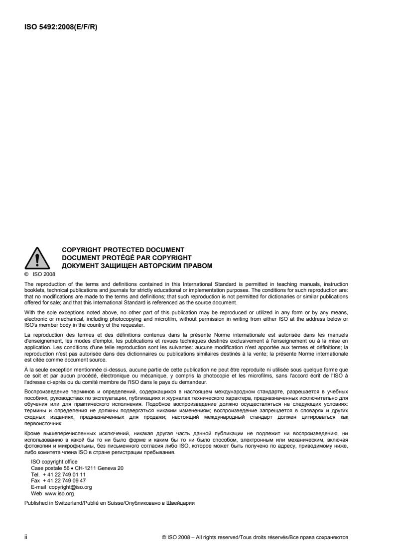 ISO 5492:2008 is published in three official languages (English, French, Russian) with German and Spanish equivalents for information. Reproduction of the defined terms for teaching or implementation is permitted under ISO conditions (non‑commercial, unmodified, source cited).