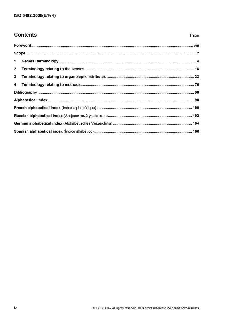 ISO 5492:2008 is a standard that defines terms for sensory analysis, which is used to evaluate products using the sense organs. The terms are categorized into general terminology, terminology relating to the senses, terminology relating to organoleptic attributes, and terminology relating to methods. The document includes terms in English, French, Russian, German, and Spanish, but only the terms in the official languages can be considered ISO terms and definitions.