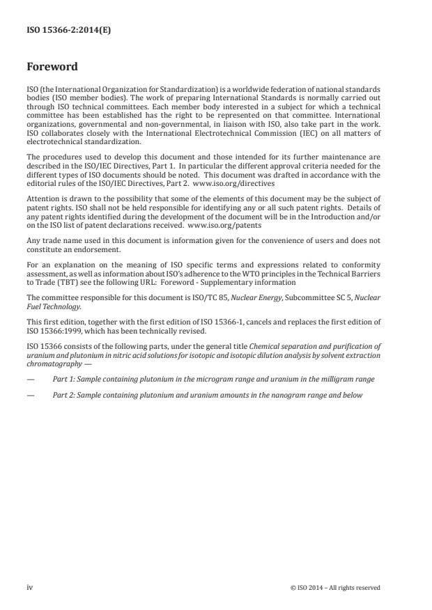 ISO 15366-2:2014 is a standard published by the International Organization for Standardization (ISO). Its full title is "Nuclear fuel technology - Chemical separation and purification of uranium and plutonium in nitric acid solutions for isotopic and isotopic dilution analysis by solvent extraction chromatography - Part 2: Samples containing plutonium and uranium in the nanogram range and below". This standard covers: ISO 15366-2:2014 describes procedures to chemically separate and purify uranium and plutonium in dissolved solutions of irradiated light water reactor fuels and in samples of high active liquid waste of spent fuel reprocessing plants, prior to their isotopic analysis by e.g. mass spectrometric method or alpha spectrometry. ISO 15366-2:2014 describes a slightly different separation technique from ISO 15366-1, based on the same chemistry, using smaller columns, different support material and special purification steps, applicable to samples containing plutonium and uranium amounts in the nanogram range and below. The detection limits were found to be 500 pg plutonium and 500 pg uranium.