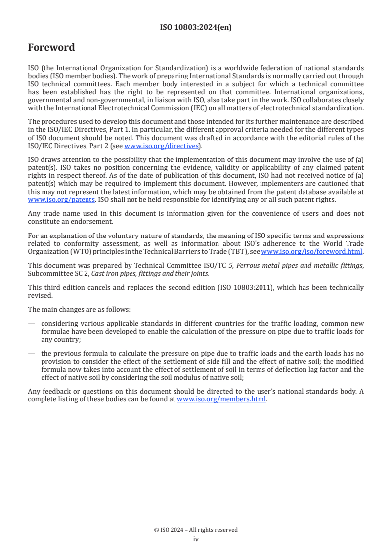 ISO 10803:2024 is a standard published by the International Organization for Standardization (ISO). Its full title is "Design method for ductile iron pipes". This standard covers: This document specifies the design of ductile iron pipes used for conveying water, sewerage and other fluids — with or without internal pressure, and — with or without earth and traffic loading. The design method defined in this document is applicable to ductile iron pipes conforming to ISO 2531, ISO 7186 and ISO 16631.
