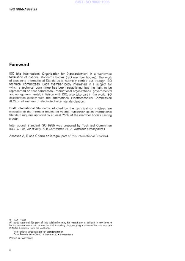 ISO 9855:1993 is a standard published by the International Organization for Standardization (ISO). Its full title is "Ambient air - Determination of the particulate lead content of aerosols collected on filters - Atomic absorption spectrometric method". This standard covers: The principle of the method specified is based on digesting with acid the particulate material collected on a filter, solubilizing any lead present und analysing the sample solution by atomic absorption spectrometry (AAS). The method is applicable to ambient air samples with particulate lead contents, such that the amount of deposited particulate lead collected on the filter is greater than 1 µg if flame AAS is used. Final determination by graphite furnace AAS allows measurement of quantities of less than 1 µg, but is only applicable after experimental validation of detection limits.