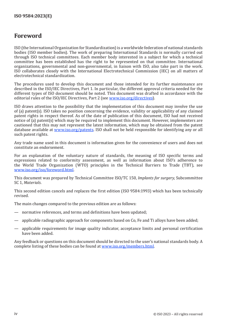 ISO 9584:2023 is a standard published by the International Organization for Standardization (ISO). Its full title is "Implants for surgery - Non-destructive testing - Radiographic examination of cast metallic surgical implants". This standard covers: This document establishes a method for detecting and evaluating internal imperfections of cast metallic surgical implants and related weldments. The procedures established in this document apply to film-based methods. The recommendations on the acceptance limits for internal imperfections in cast metallic surgical implants are given in Annex A. NOTE In this document, when not otherwise specified, the term “manufacturer” refers to the “implant manufacturer”, and the term “product” refers to the “metallic cast implant for surgery” or to the “component of metallic cast implant for surgery”.