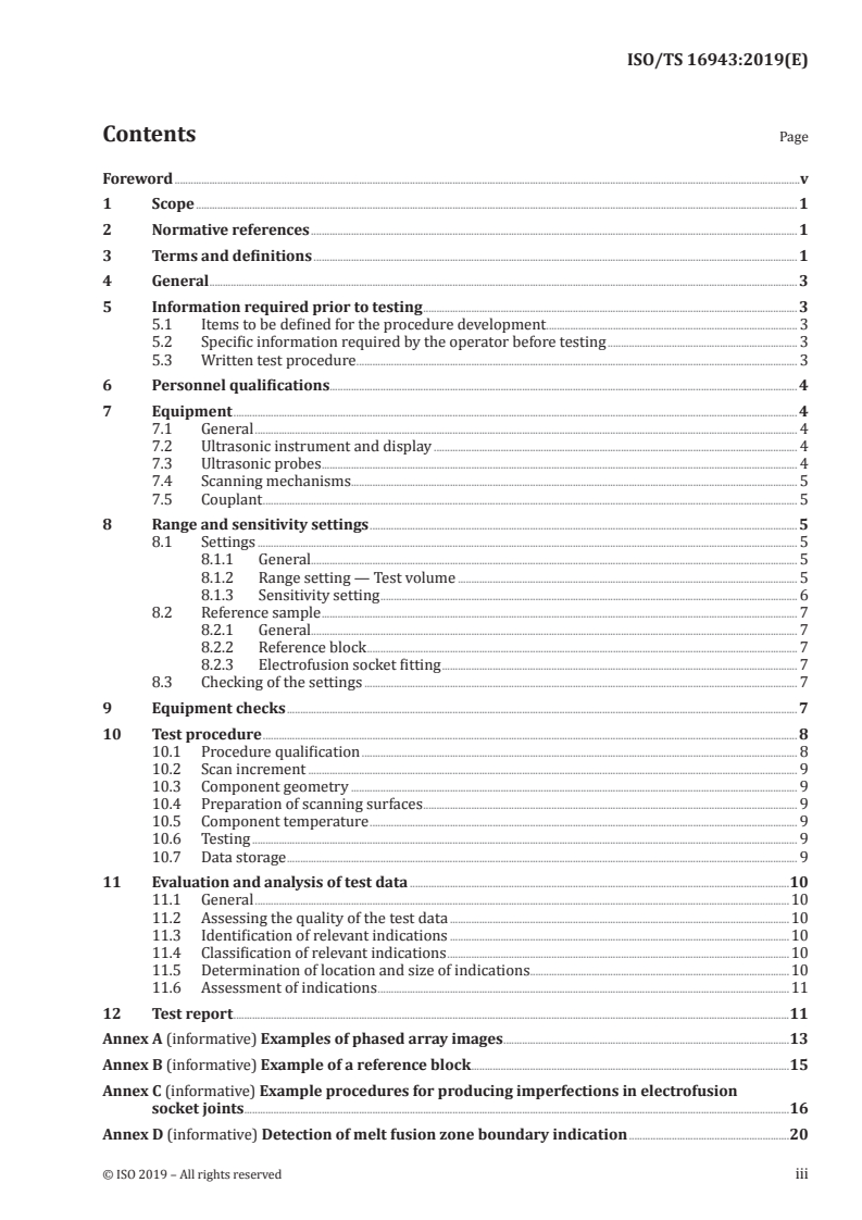 This document describes the phased array ultrasonic testing (PAUT) of polyethylene electrofusion (EF) socket joints used for the conveyance of fluids. This document provides a test whereby the presence of imperfections such as voids, wire dislocation, misalignment, pipe under-penetration, particulate contamination, cold fusion and lack of fusion in electrofusion socket joints can be detected. The technique is only applicable to polyethylene electrofusion socket fittings without a barrier to ultrasonic waves. This document also provides requirements for procedure qualification and guidance for personnel qualifications, which are essential for the application of this test method NOTE 1 At the time of publication, experience only exists on the use of PAUT for polyethylene (PE80 and PE100) electrofusion socket joint sizes between 90 mm and 710 mm (SDR 11 and 17)[7][8][9][10][11][12][13]. NOTE 2 Round robin testing has shown that PAUT is a viable method for enhancing the integrity assessment of electrofusion joints[16]. NOTE 3 This document does not apply to the detection of unscraped pipe. Such detection can be achieved by a simple visual inspection, provided mechanical scraping tools are employed.