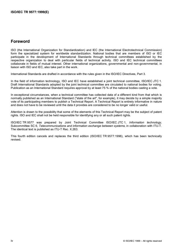 ISO/IEC TR 9577:1999 is a technical report published by the International Organization for Standardization (ISO). Its full title is "Information technology - Protocol identification in the network layer". This standard covers: This Recommendation | Technical Report provides: a) the description of a means to permit a protocol to be identified; b) a record of the structure and allowable ranges of protocol identifier(s) which can be assigned by ITU-T, ISO/IEC and other authorities; c) a record of the values of protocol identifiers used by OSI Network layer protocols and non-OSI protocols occupying a similar position: in particular, protocols with protocol control information commencing in octet 1 of the protocol data unit (header-oriented protocols), and protocols with protocol control information commencing in the final octet of the protocol data unit (trailer-oriented protocols), are covered; and d) a record of the values that are in use as protocol control information in non-Network layer protocols where they impact on Network layer protocol identification. The application of this Recommendation | Technical Report is: a) in the identification of internationally standardized Network layer protocols operating directly above the Data Link service; b) in the identification of protocols used in conjunction with internationally standardized Network layer protocols that operate directly above the Data Link service; and c) to distinguish between Internationally standardized Network layer protocols, and other internationally standardized protocols used in conjunction with internationally standardized Network layer protocols. This Recommendation | Technical Report is for use by ITU-T Study Groups, ISO/IEC Technical Committees and other authorities in applying the principles contained in clause 4, and in selecting an unused value or values from the range of values permitted in clauses 5 or 6, as appropriate. When a new value is selected, that value and its usage should be brought to the attention of ITU-T Study Group 7 or ISO/IEC JTC 1 SC6 so that this Recommendation | Technical Report can be amended.