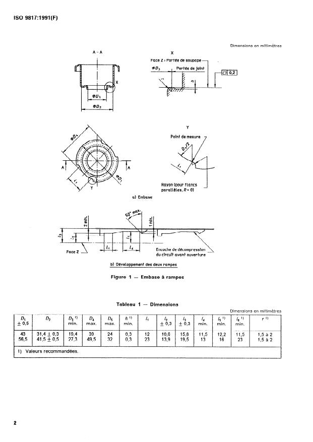 The seats with clamping ramps shown in figure 1 shall be in accordance with the dimensions given in table 1. The pressure caps shown in figure 2 shall be in accordance with the dimensions given in table 2.