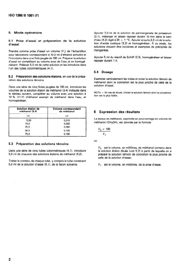 The principle is based on the conversion of the methanol present in a test portion to formaldehyde by oxidation with a solution of potassium permanganate in phosphoric acid. Reaction of the formaldehyde formed with Schiff reagent. Visual comparison of the colour obtained with the colours of standard colorimetric solutions containing known quantities of formaldehyde. - International Standards ISO 1388/1 to ISO 1377/12 cancel and replace ISO Recommendation R 1388-1970 of which they constitute a technical revision.