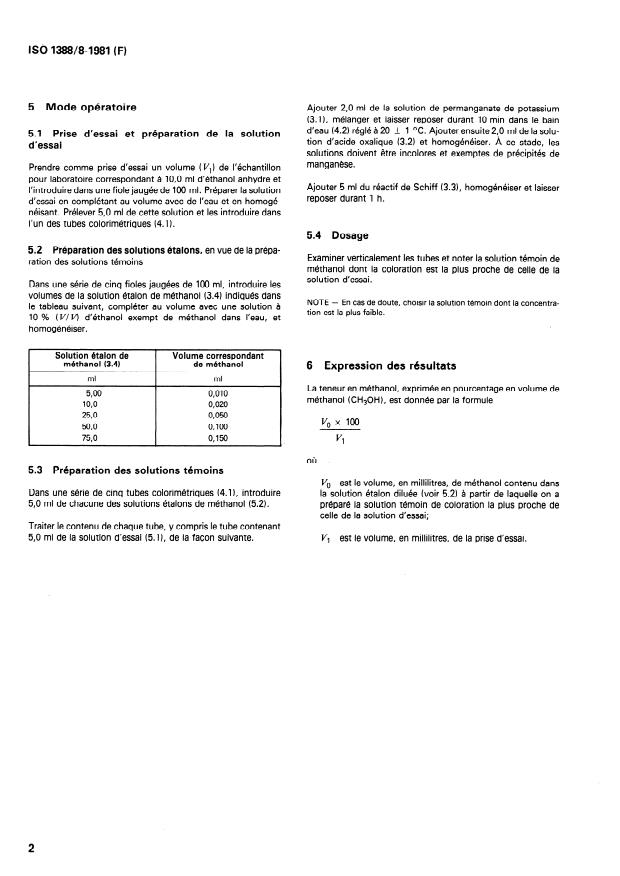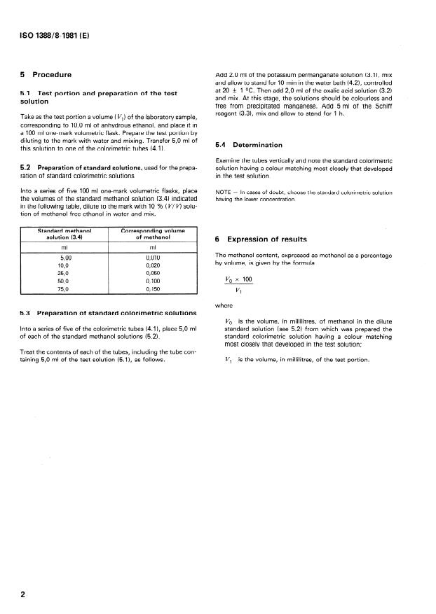 ISO 1388-8:1981 is a standard published by the International Organization for Standardization (ISO). Its full title is "Ethanol for industrial use - Methods of test - Part 8: Determination of methanol content (methanol contents between 0,10 and 1,50 % (V/V)) - Visual colorimetric method". This standard covers: The principle is based on the conversion of the methanol present in a test portion to formaldehyde by oxidation with a solution of potassium permanganate in phosphoric acid. Reaction of the formaldehyde formed with Schiff reagent. Visual comparison of the colour obtained with the colours of standard colorimetric solutions containing known quantities of formaldehyde. - International Standards ISO 1388/1 to ISO 1377/12 cancel and replace ISO Recommendation R 1388-1970 of which they constitute a technical revision.