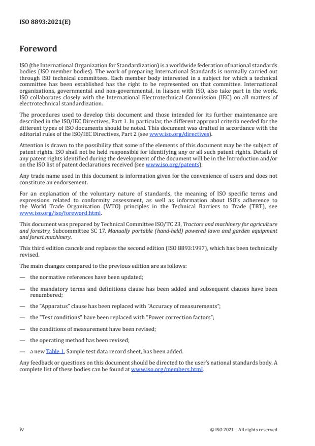 ISO 8893:2021 is a standard published by the International Organization for Standardization (ISO). Its full title is "Forestry machinery - Portable brush-cutters and grass-trimmers - Engine performance and fuel consumption". This standard covers: This document specifies a method for testing the performance and fuel consumption of internal combustion engines used to power portable brush-cutters and grass trimmers.