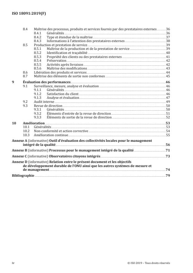 La présente Norme internationale spécifie les exigences relatives au système de management de la qualité lorsqu'un organisme: a) doit démontrer son aptitude à fournir constamment des produits et des services conformes aux exigences des clients et aux exigences légales et réglementaires applicables; et b) vise à accroître la satisfaction de ses clients par l'application efficace du système, y compris les processus pour l'amélioration du système et l'assurance de la conformité aux exigences des clients et aux exigences légales et réglementaires applicables. Toutes les exigences de la présente Norme internationale sont génériques et prévues pour s'appliquer à tout organisme, quels que soient son type ou sa taille, ou les produits et services qu'il fournit. NOTE 1 Dans la présente Norme internationale, les termes «produit» ou «service» s'appliquent uniquement aux produits et services destinés à, ou exigés par, un client. NOTE 2 L'expression «legal requirement» recouvre en anglais le concept, utilisé dans la présente Norme internationale, d'exigence légale et réglementaire. Le présent document donne des lignes directrices aux collectivités locales pour leur permettre de comprendre et de mettre en œuvre un système de management de la qualité conforme aux exigences de l'ISO 9001:2015, afin de répondre aux besoins et attentes de leurs clients/citoyens et de toutes les autres parties intéressées pertinentes en leur assurant la fourniture homogène de produits et services. Il encourage la mise en œuvre d'un système de management de la qualité d'une manière responsable et redevable, par l'application de l'ISO 9001 de façon exhaustive. Les présentes lignes directrices ne modifient pas les exigences de l'ISO 9001 et n'en ajoutent pas de nouvelles. Il est applicable à tous les processus de la collectivité locale, à tous les niveaux (c'est-à-dire stratégiques, tactico-managériaux et opérationnels), afin de constituer un système global de management de la qualité visant à permettre à la collectivité locale d'atteindre ses objectifs. Le caractère complet de ce système est essentiel pour s'assurer que tous les secteurs de la collectivité locale ont un niveau spécifié de fiabilité (c'est-à-dire efficacité des processus). L'Annexe A, en tant que point de départ pour les utilisateurs du présent document, fournit une méthode de diagnostic permettant aux collectivités locales d'évaluer le périmètre et la maturité de leurs processus et de leurs produits et services. L'Annexe B indique les processus nécessaires pour fournir des produits et services fiables aux clients/citoyens.