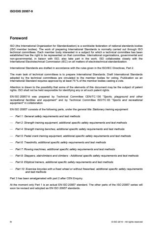 ISO 20957-9:2016 is a standard published by the International Organization for Standardization (ISO). Its full title is "Stationary training equipment - Part 9: Elliptical trainers, additional specific safety requirements and test methods". This standard covers: ISO 20957-9:2016 specifies additional safety requirements for elliptical trainers in addition to the general safety requirements of ISO 20957‑1. ISO 20957-9:2016 specifies safety requirements for cardiovascular equipment with a closed pattern motion and/or a reciprocating motion, where the user's feet are designed to be in contact with the footplatform, but not including steppers, performed from either a standing or seated position.