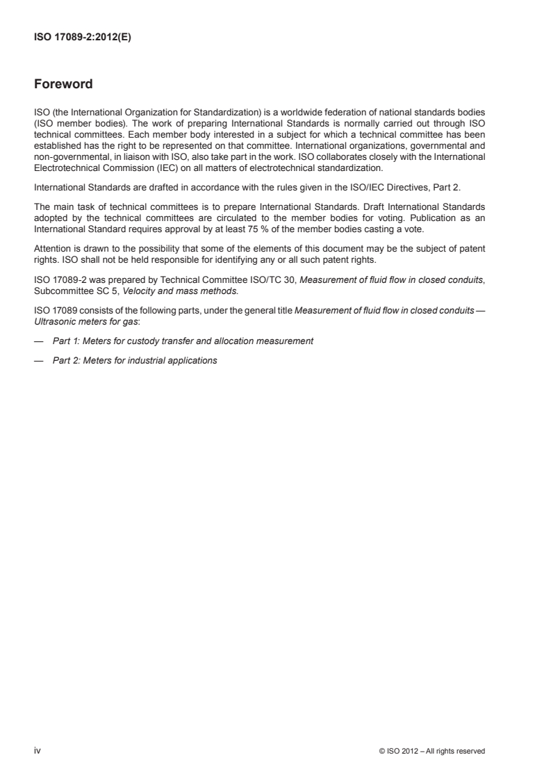 ISO 17089-2:2012 is a standard published by the International Organization for Standardization (ISO). Its full title is "Measurement of fluid flow in closed conduits - Ultrasonic meters for gas - Part 2: Meters for industrial applications". This standard covers: This part of ISO 17089 specifies requirements and recommendations for ultrasonic gas meters (USMs), which utilize acoustic signals to measure the flow in the gaseous phase in closed conduits. This part of ISO 17089 is applicable to transit time USMs and is focused towards industrial flow measurement. Included are meters comprising meter bodies as well as meters with field-mounted transducers. There are no limits on the size of the meter. It can be applied to the measurement of almost any type of gas; such as but not limited to air, hydrocarbon gases, and steam. This part of ISO 17089 specifies performance, calibration (when required), and output characteristics of USMs for gas flow measurement and deals with installation conditions. NOTE It is possible that national or other regulations apply which can be more stringent than those in this part of ISO 17089.