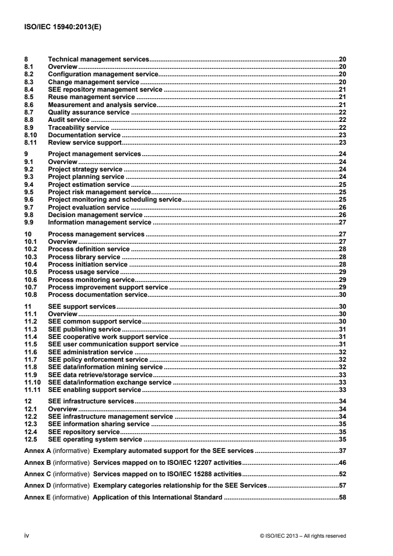 - Mappings and guidance: informative annexes that map SEE services to ISO/IEC 12207:2008, ISO/IEC 15288, and provide examples of automated support and application guidance.