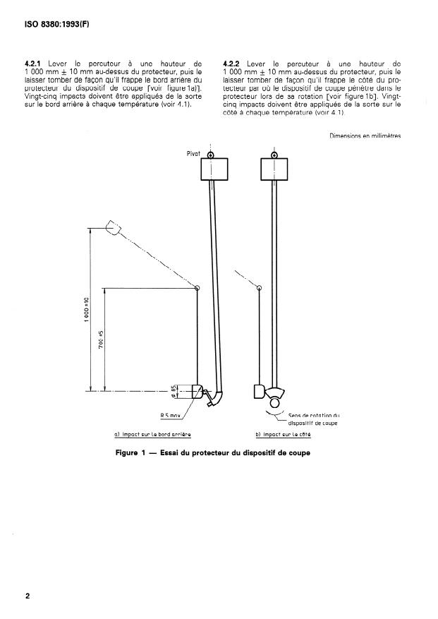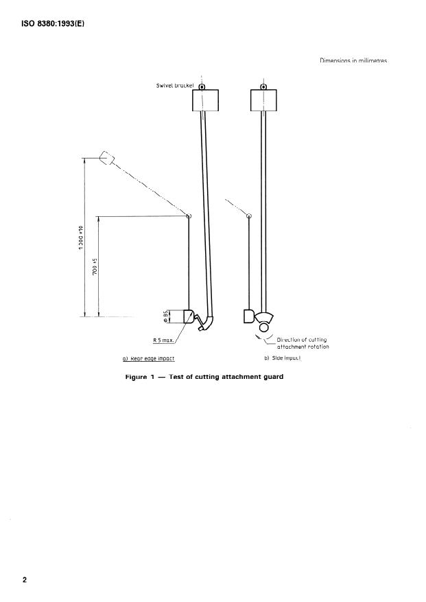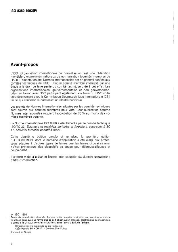 ISO 8380:1993 is an international standard developed by the International Organization for Standardization (ISO) that specifies test methods and strength requirements for cutting attachment guards on portable hand-held combustion engine brush-cutters and grass-trimmers. Primarily intended for forestry machinery, this standard ensures the safety of operators by protecting them from flying debris and accidental contact with the cutting attachments. The cutting attachment guard dimensions referenced in this standard conform to ISO 7918, while it explicitly excludes guards designed for lawn-trimmers, which are covered under ISO 10518.