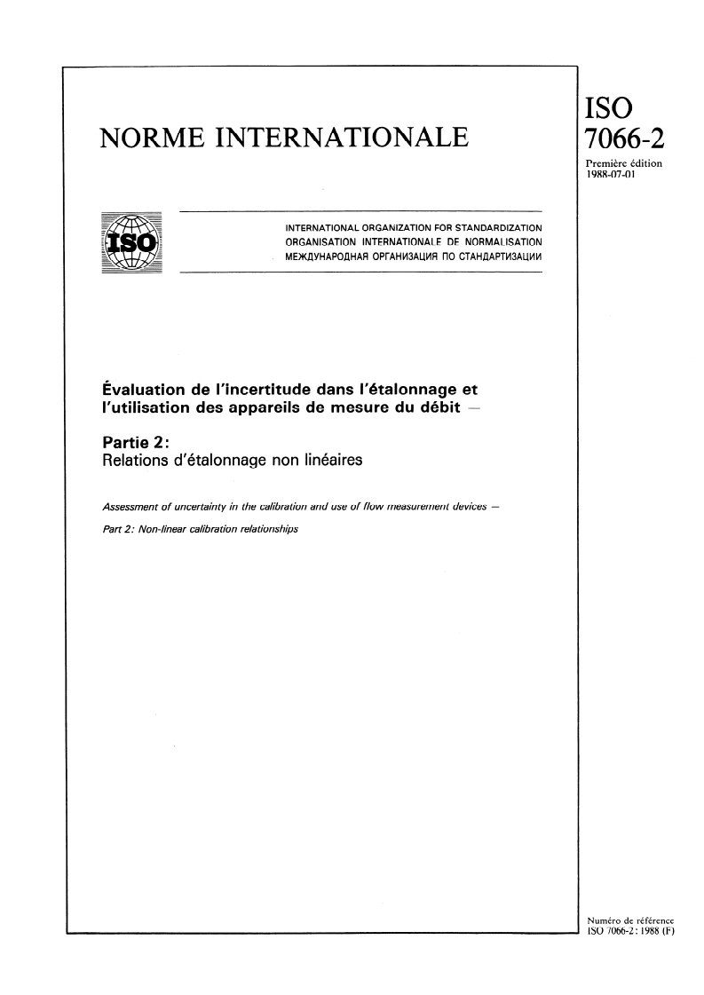 ISO 7066-2:1988 is a standard published by the International Organization for Standardization (ISO). Its full title is "Assessment of uncertainty in the calibration and use of flow measurement devices - Part 2: Non-linear calibration relationships". This standard covers: Describes the procedures for fitting a quadratic, cubic or higher degree polynomial expression to a non-linear set of calibration data, using the least-squares criterion, and of assessing the uncertainty associated with the resulting calibration curve. The method of fitting a straight line to flow measurement calibration data is dealt with in ISO 7066-1.