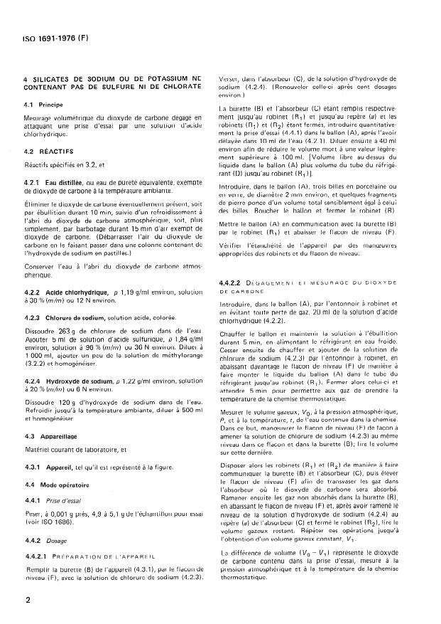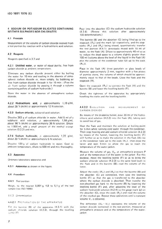 제목: ISO 1691:1976 - 산업용 나트륨 및 포타슘 실리케이트 - 탄산염 함량 결정 - 가스 부피 측정 방법 내용: 예비 실험에 의해 정의된 세 가지 경우가 고려된다: 황화물 및 염소산염이 없는 실리케이트; 황화물이 있는 실리케이트; 염소산염이 있는 실리케이트. 이 방법은 메틸 오렌지를 포함한 산화시킨 시험 견본을 삶은 후 증기에 리드 페이퍼 스트립을 함께 끼워 사용한다. 황화물이 존재하면 종이가 검정색으로 변하며, 염소산염이 존재하면 메틸 오렌지가 변색된다. 황화물이나 염소산염이 없는 실리케이트에서 탄산화물이 발생할 때, 수소 염산 용액과의 반응으로 발생하는 이산화탄소의 부피 측정을 한다. 황화물의 산화 및 염소산염의 환원 원리가 명시되어 있다.