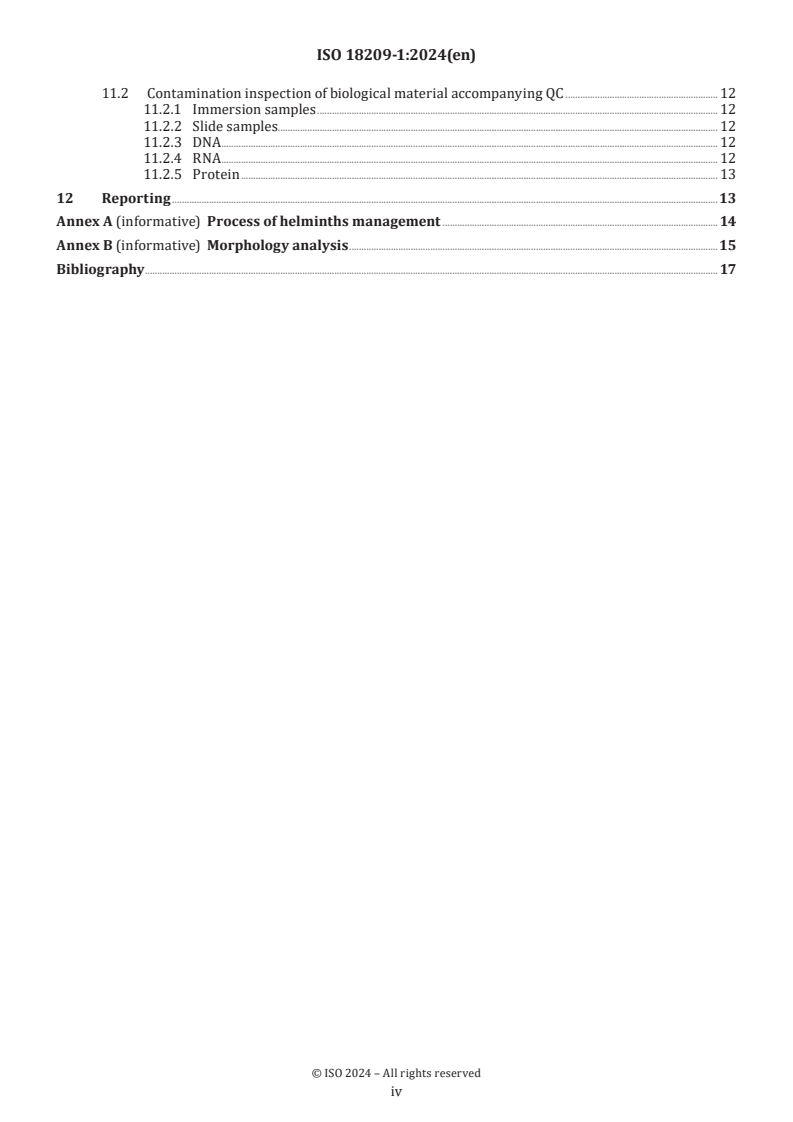 ISO 18209-1:2024 is a standard published by the International Organization for Standardization (ISO). Its full title is "Biotechnology - Biobanking of parasites - Part 1: Helminths". This standard covers: This document provides requirements for the biobanking of helminths as parasitic resources including the collection, safeguarding, classification, proliferation, preservation, storage and distribution of helminths. This document sets requirements for the quality of helminths and their associated data, the data collection, and safety management when handling the helminths as a source of human disease infection. This document is applicable to all organizations performing biobanking with helminths used for research and development. NOTE International, national or regional regulations or requirements, or multiple of them, can also apply to specific topics covered in this document.