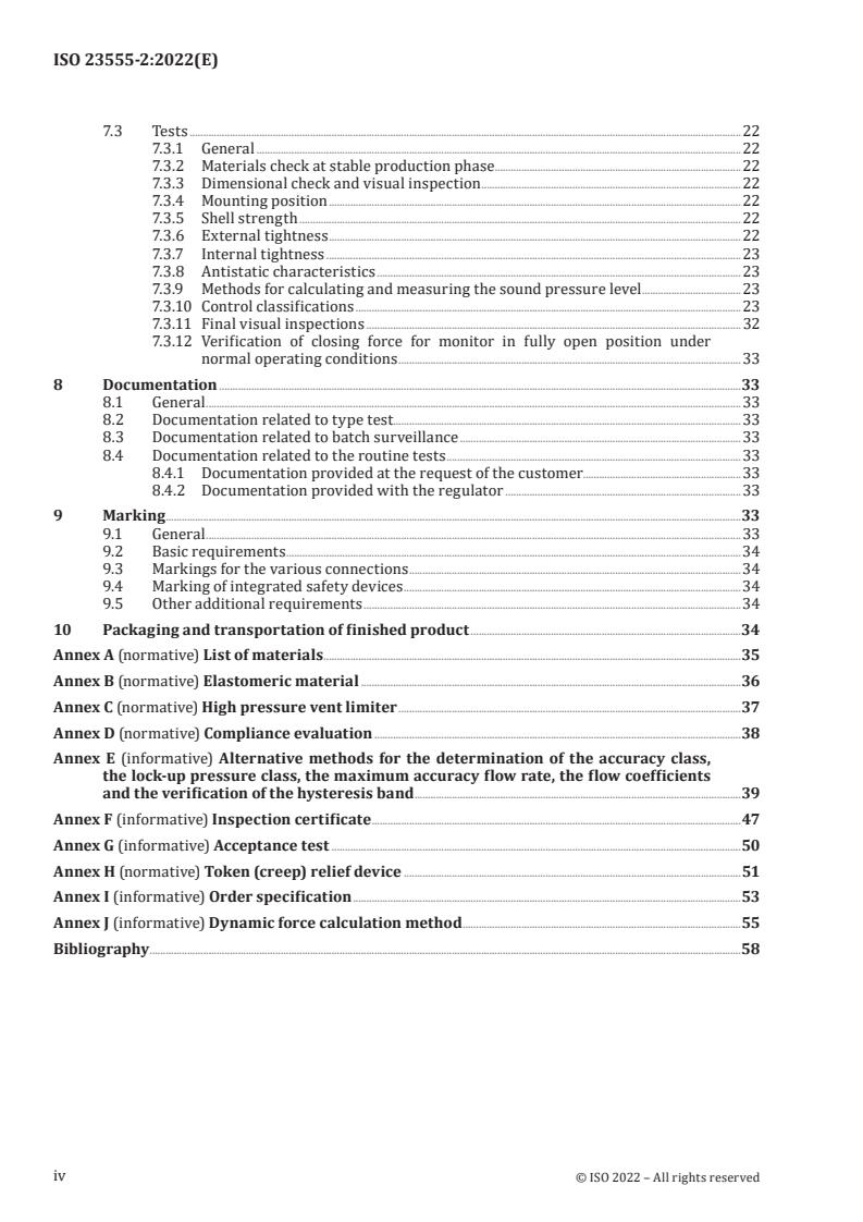 - Annexes: Normative and informative annexes provide materials lists, elastomer guidance, vent limiter and creep device definitions, compliance evaluation, inspection certificate and test templates, dynamic force calculations and order specification guidance.