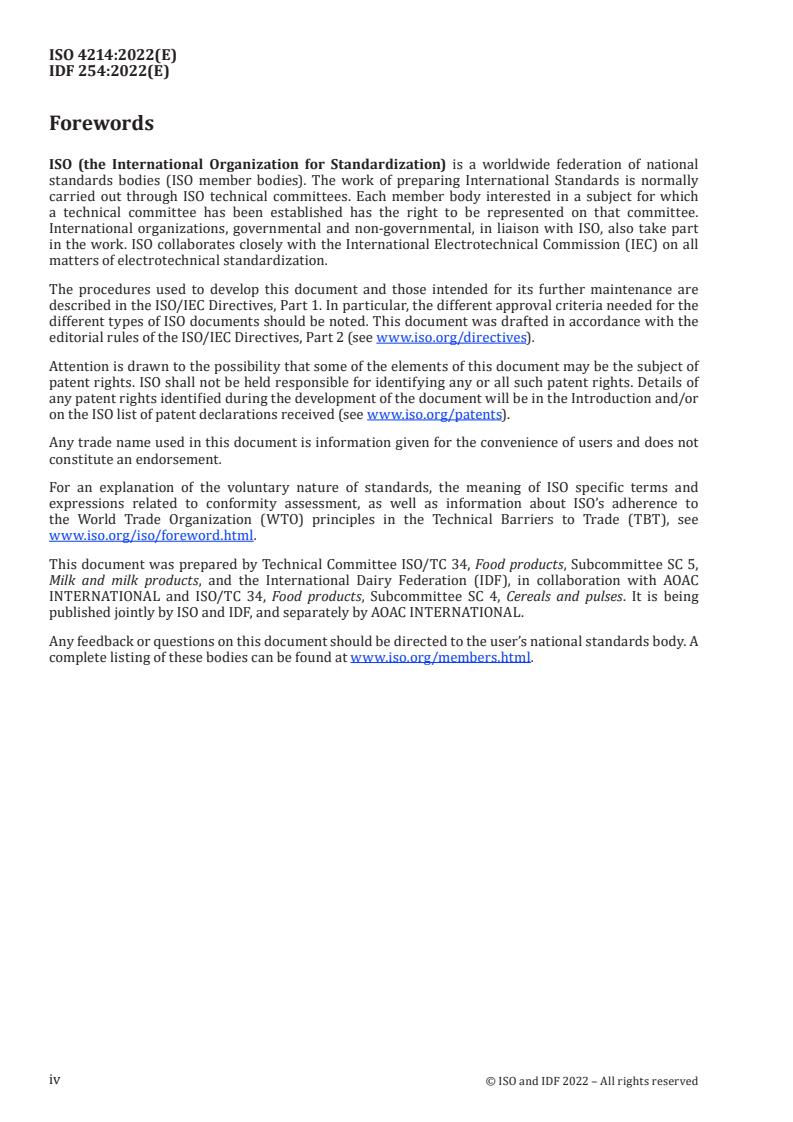- ISO 4214:2022 was developed jointly by ISO and the International Dairy Federation (IDF) and is also published separately by AOAC INTERNATIONAL. For laboratory accreditation and conformity, refer to national standards bodies and relevant accreditation guidance.