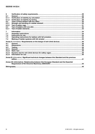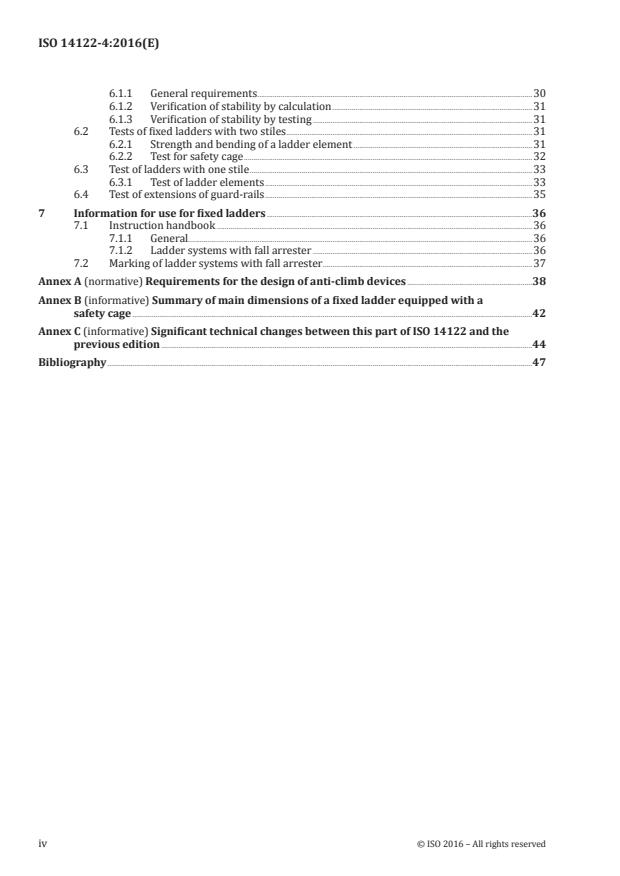 ISO 14122-4:2016 is a standard published by the International Organization for Standardization (ISO). Its full title is "Safety of machinery - Permanent means of access to machinery - Part 4: Fixed ladders". This standard covers: ISO 14122-4:2016 gives requirements for fixed ladders which are a part of a stationary machine, and to the non-powered adjustable parts (e.g. foldable, slidable) and movable parts of fixed ladder systems. NOTE 1 "Fixed" means of access are those mounted in such a manner (for example, by screws, nuts, welding) that they can only be removed by the use of tools. ISO 14122-4:2016 specifies minimum requirements that also apply when the same means of access is required as the part of the building or civil construction (e.g. fixed ladders) where the machine is installed, on condition that the main function of that part of the construction is to provide a means of access to the machine. NOTE 2 Where no local regulation or standards exists, this part of ISO 14122 may be used also for means of access which are outside the scope of the standard. It is intended that this part of ISO 14122 be used with ISO 14122‑1 to give the requirements for fixed ladder systems. The ISO 14122 series as a whole is applicable to both stationary and mobile machinery where fixed means of access are necessary. It is not applicable to powered means of access such as lifts, escalators, or other devices specially designed to lift persons between two levels. ISO 14122-4:2016 is not applicable to machinery manufactured before the date of its publication.