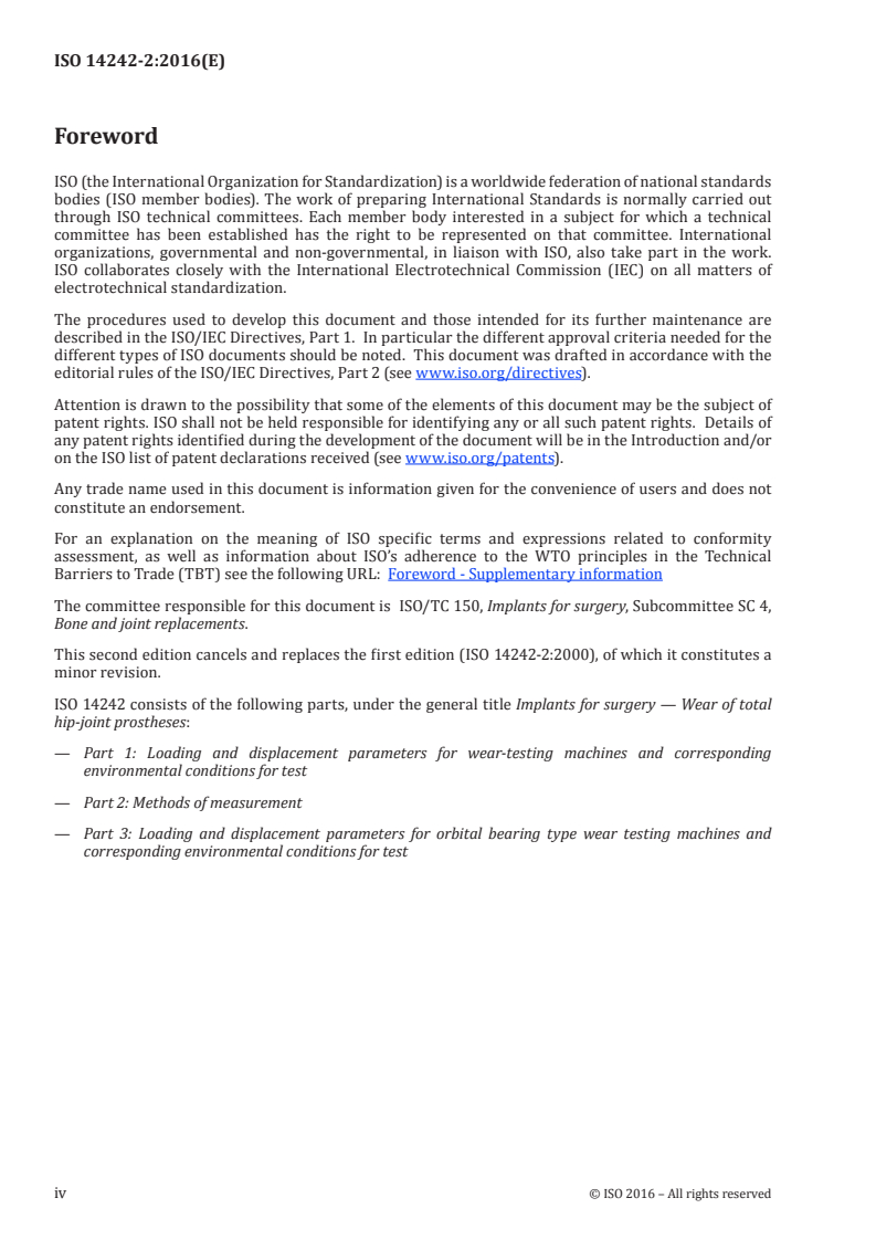 ISO 14242-2:2016 is a standard published by the International Organization for Standardization (ISO). Its full title is "Implants for surgery - Wear of total hip-joint prostheses - Part 2: Methods of measurement". This standard covers: ISO 14242-2:2016 specifies methods of assessment of wear of the acetabular component of total hip-joint prostheses using gravimetric techniques and changes in dimensional form of components tested in accordance with ISO 14242‑1 or ISO 14242‑3 as appropriate.