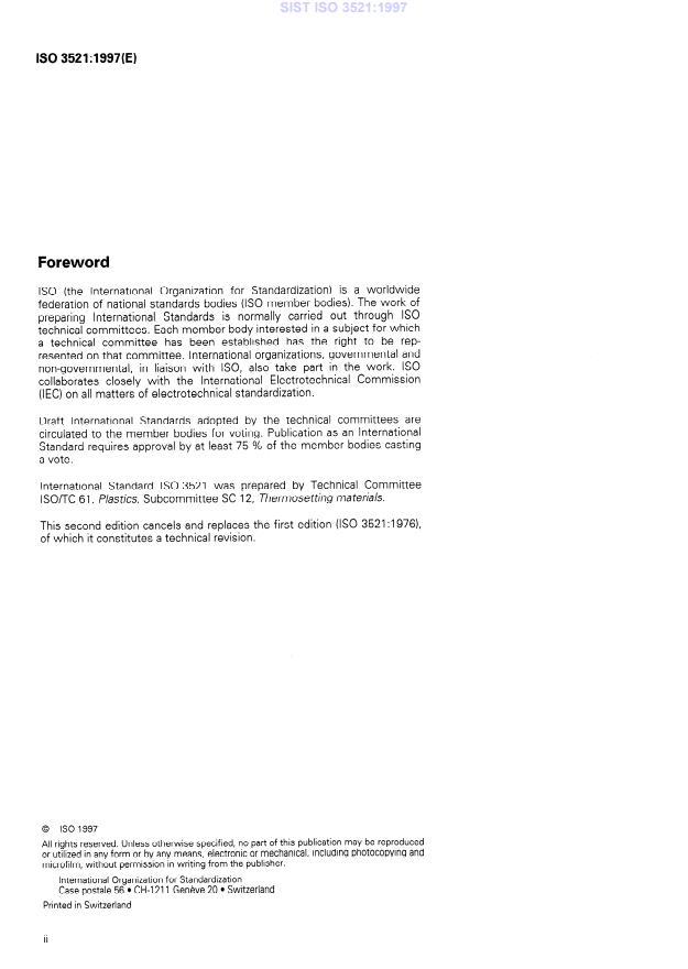 ISO 3521:1997 is a standard published by the International Organization for Standardization (ISO). Its full title is "Plastics - Unsaturated polyester and epoxy resins - Determination of overall volume shrinkage". This standard covers: Describes a method for the determination of the overall volume shrinkage of unsaturated polyester and epoxsy resins. Replaces the first edition.