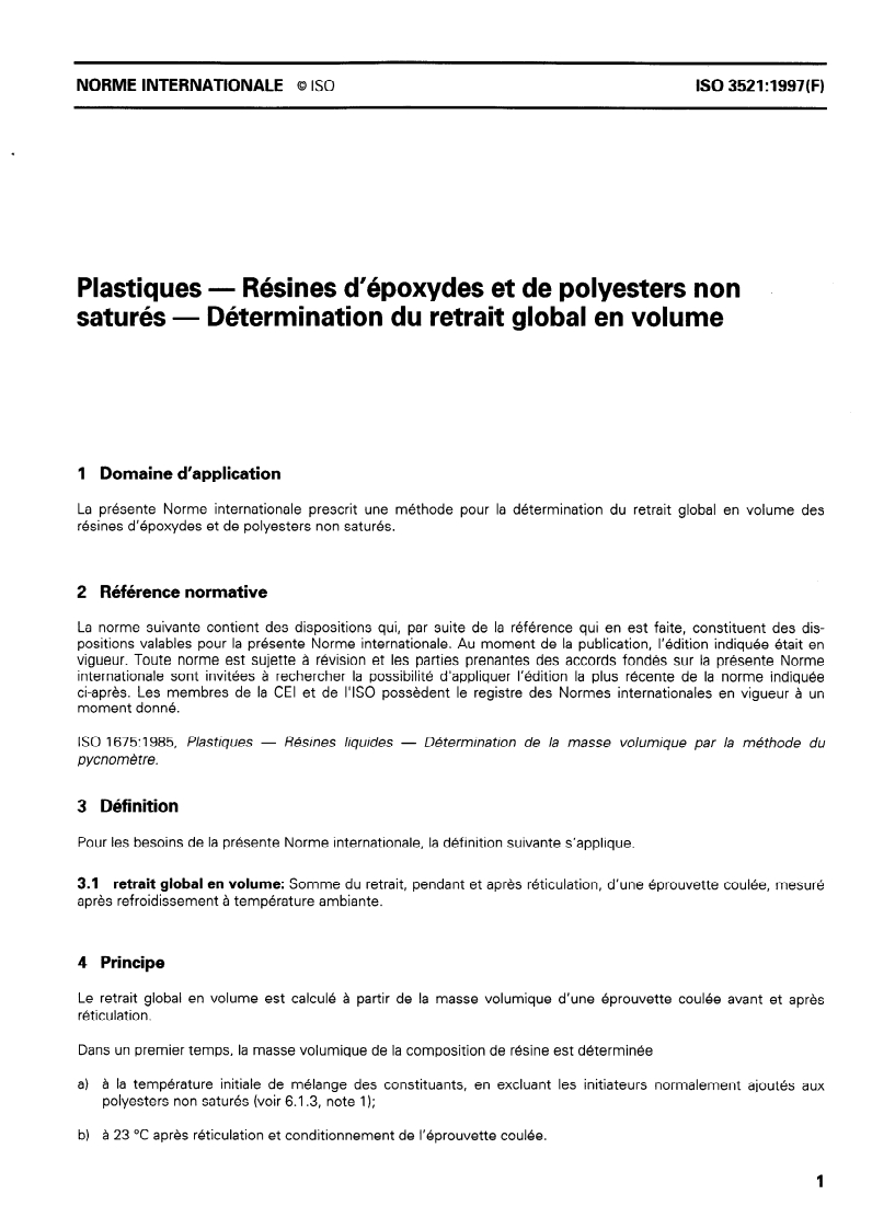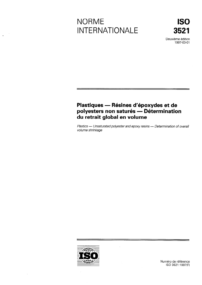 ISO 3521:1997 - Plastiques — Résines d'époxydes et de polyesters non saturés — Détermination du retrait global en volume Released:2/20/1997